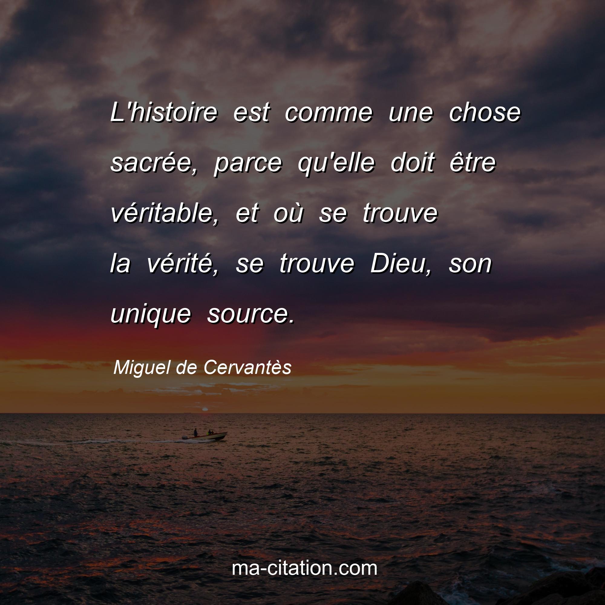 Citation sur la vie de Miguel de Cervantès :L'histoire est comme une chose sacrée, parce qu'elle doit être véritable, et où se trouve la vérité, se trouve Dieu, son unique source.