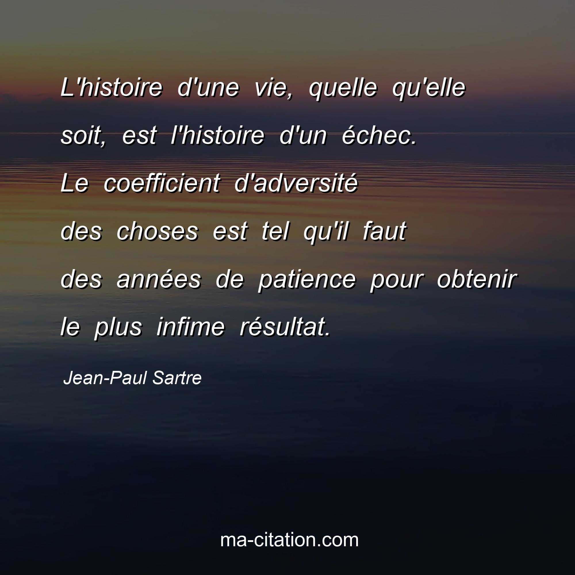Citation sur la vie de Jean-Paul Sartre :L'histoire d'une vie, quelle qu'elle soit, est l'histoire d'un échec. Le coefficient d'adversité des choses est tel qu'il faut des années de patience pour obtenir le plus infime résultat.