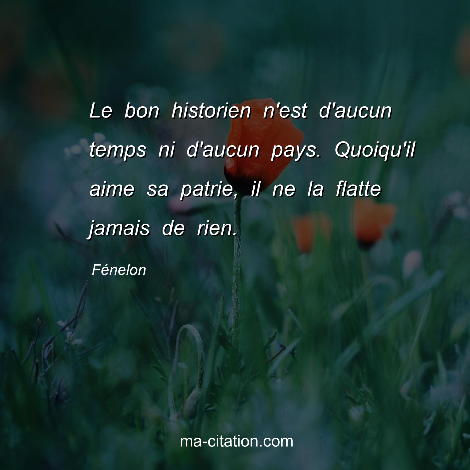Fénelon est l'auteur de la citation sur la vie "Le bon historien n'est d'aucun temps ni d'aucun pays. Quoiqu'il aime sa patrie, il ne la flatte jamais de rien.".