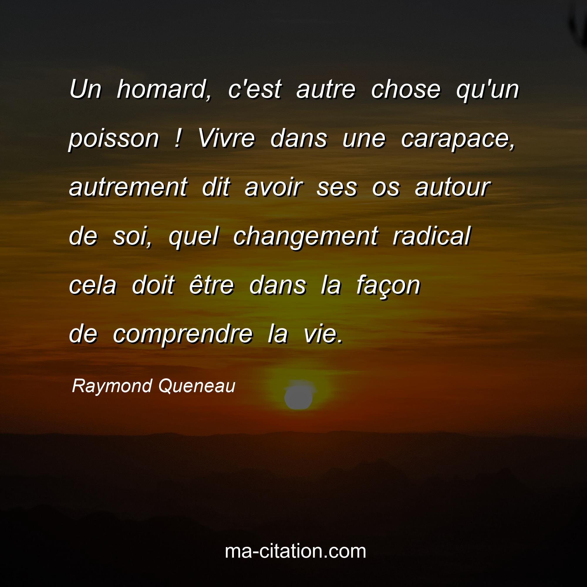 Citation sur la vie de Raymond Queneau :Un homard, c'est autre chose qu'un poisson ! Vivre dans une carapace, autrement dit avoir ses os autour de soi, quel changement radical cela doit être dans la façon de comprendre la vie.