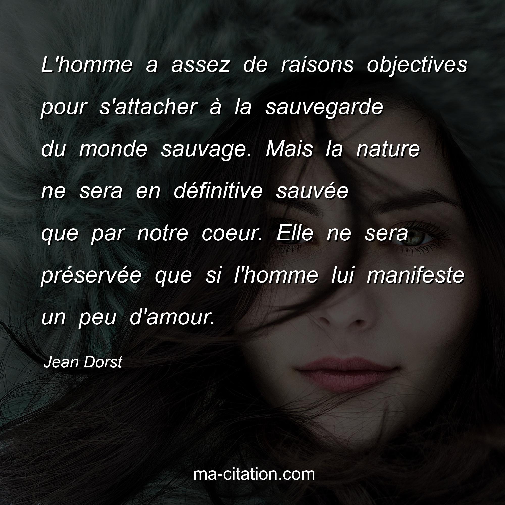 Citation sur la vie de Jean Dorst :L'homme a assez de raisons objectives pour s'attacher à la sauvegarde du monde sauvage. Mais la nature ne sera en définitive sauvée que par notre coeur. Elle ne sera préservée que si l'homme lui manifeste un peu d'amour.