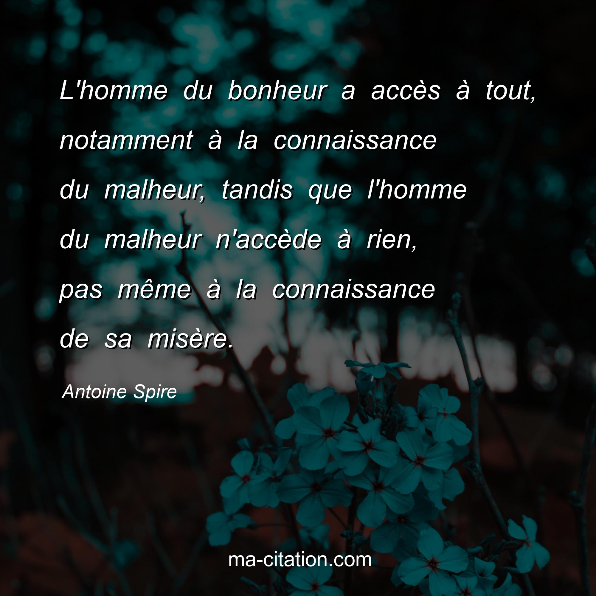 Citation sur la vie d'Antoine Spire :L'homme du bonheur a accès à tout, notamment à la connaissance du malheur, tandis que l'homme du malheur n'accède à rien, pas même à la connaissance de sa misère.