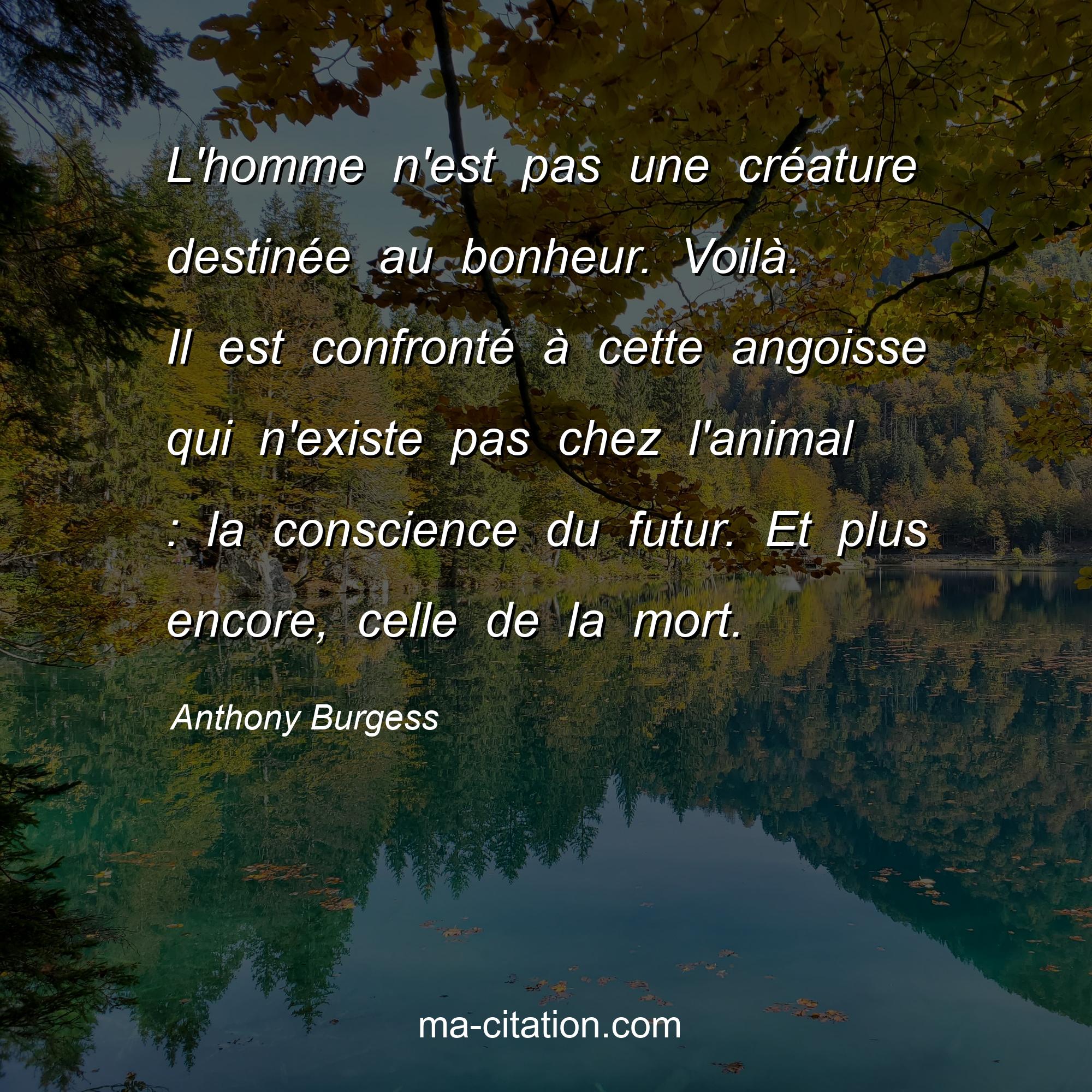 Citation sur la vie d'Anthony Burgess :L'homme n'est pas une créature destinée au bonheur. Voilà . Il est confronté à cette angoisse qui n'existe pas chez l'animal : la conscience du futur. Et plus encore, celle de la mort.