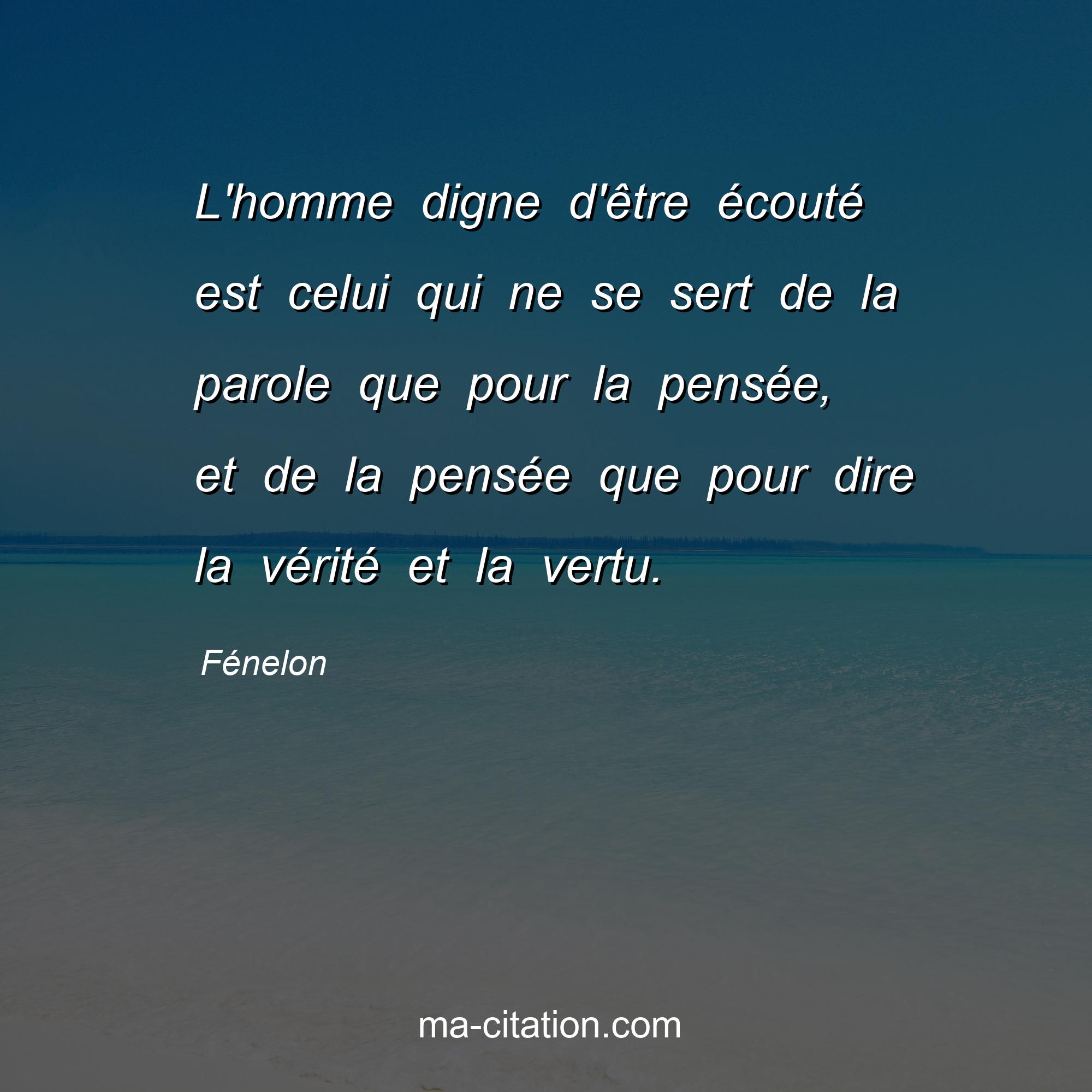 Citation sur la vie de Fénelon :L'homme digne d'être écouté est celui qui ne se sert de la parole que pour la pensée, et de la pensée que pour dire la vérité et la vertu.