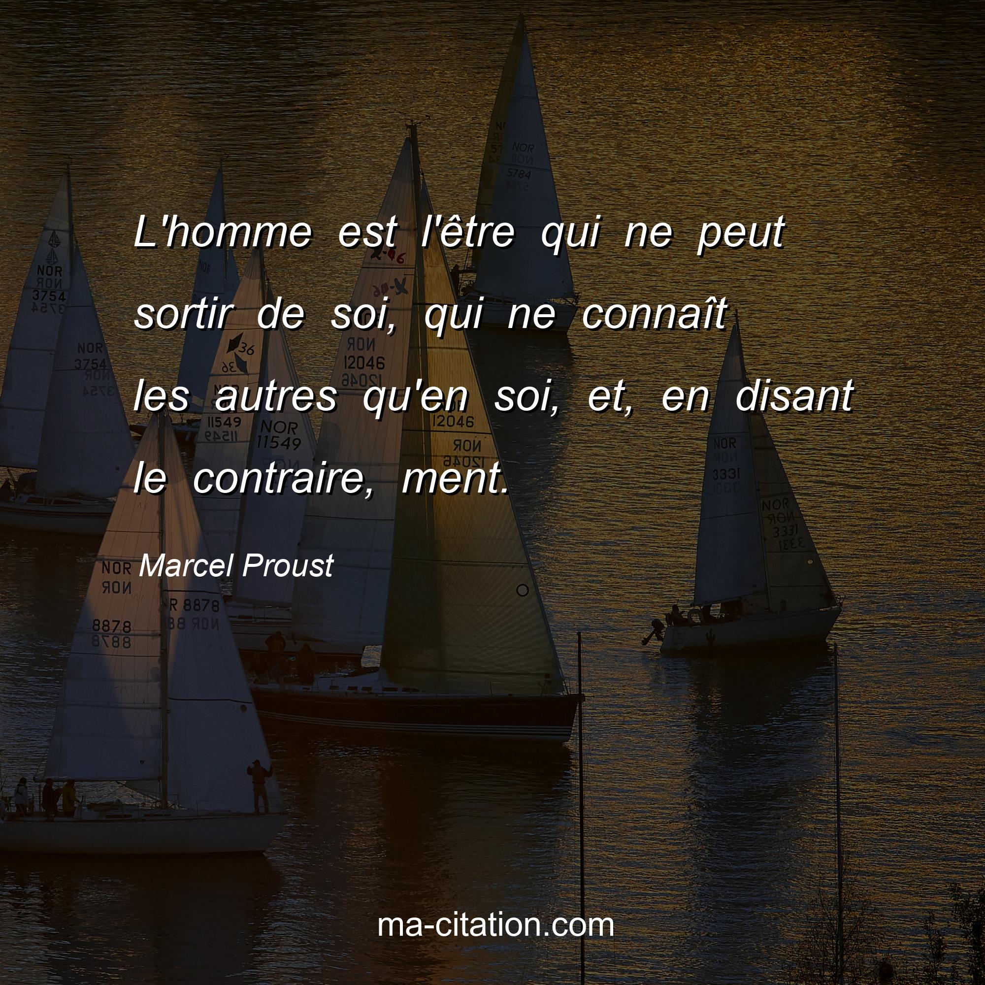 Citation sur la vie de Marcel Proust :L'homme est l'être qui ne peut sortir de soi, qui ne connaît les autres qu'en soi, et, en disant le contraire, ment.