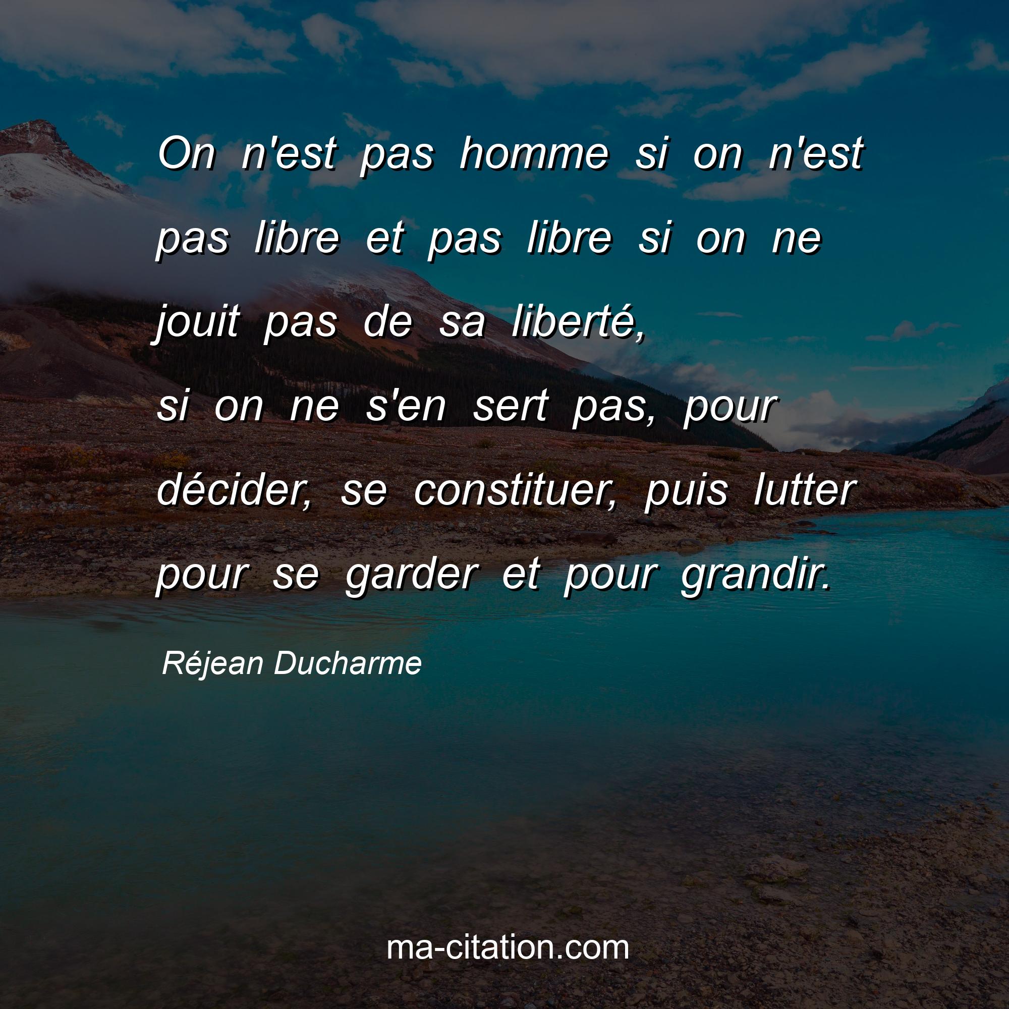 Citation sur la vie de Réjean Ducharme :On n'est pas homme si on n'est pas libre et pas libre si on ne jouit pas de sa liberté, si on ne s'en sert pas, pour décider, se constituer, puis lutter pour se garder et pour grandir.