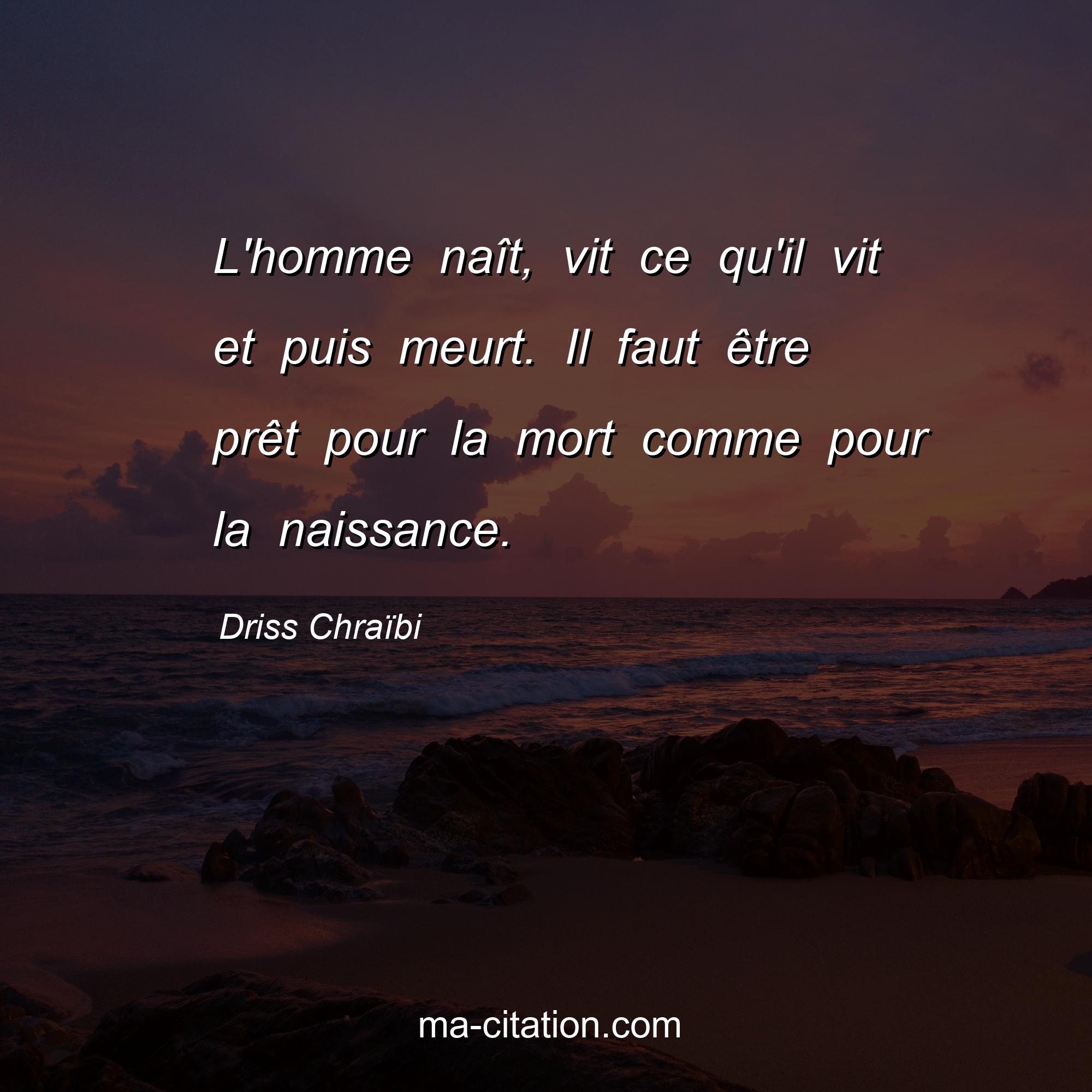Citation sur la vie de Driss Chraïbi :L'homme naît, vit ce qu'il vit et puis meurt. Il faut être prêt pour la mort comme pour la naissance.
