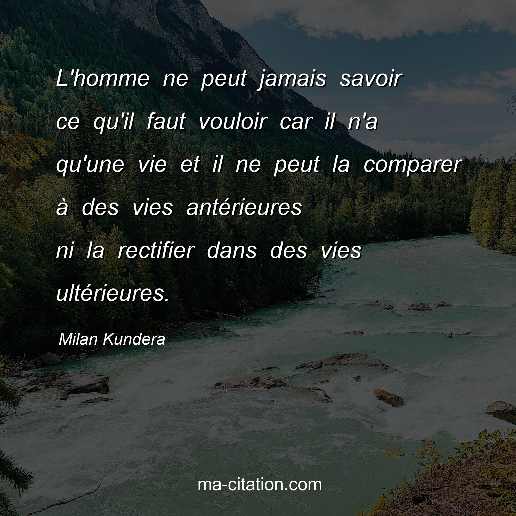 Citation sur la vie de Milan Kundera :L'homme ne peut jamais savoir ce qu'il faut vouloir car il n'a qu'une vie et il ne peut la comparer à des vies antérieures ni la rectifier dans des vies ultérieures.