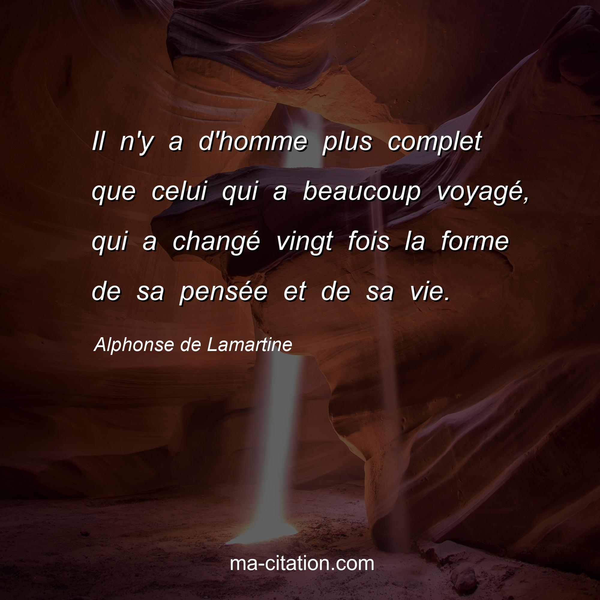 Citation sur la vie d'Alphonse de Lamartine :Il n'y a d'homme plus complet que celui qui a beaucoup voyagé, qui a changé vingt fois la forme de sa pensée et de sa vie.