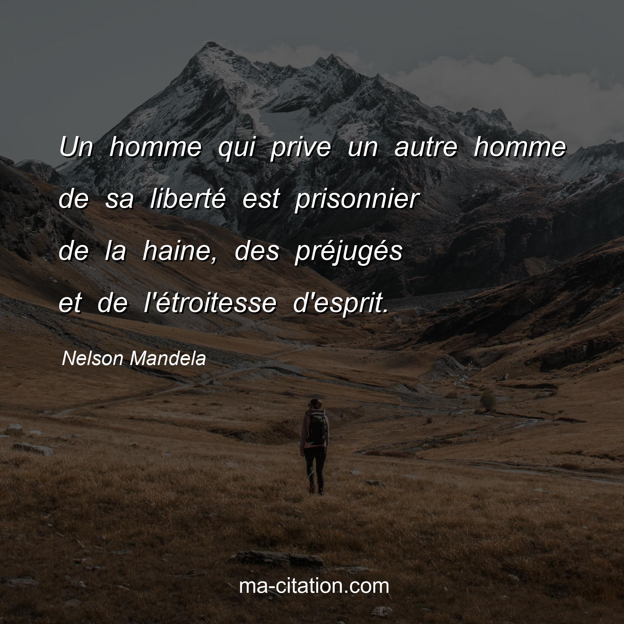 Citation sur la vie de Nelson Mandela :Un homme qui prive un autre homme de sa liberté est prisonnier de la haine, des préjugés et de l'étroitesse d'esprit.