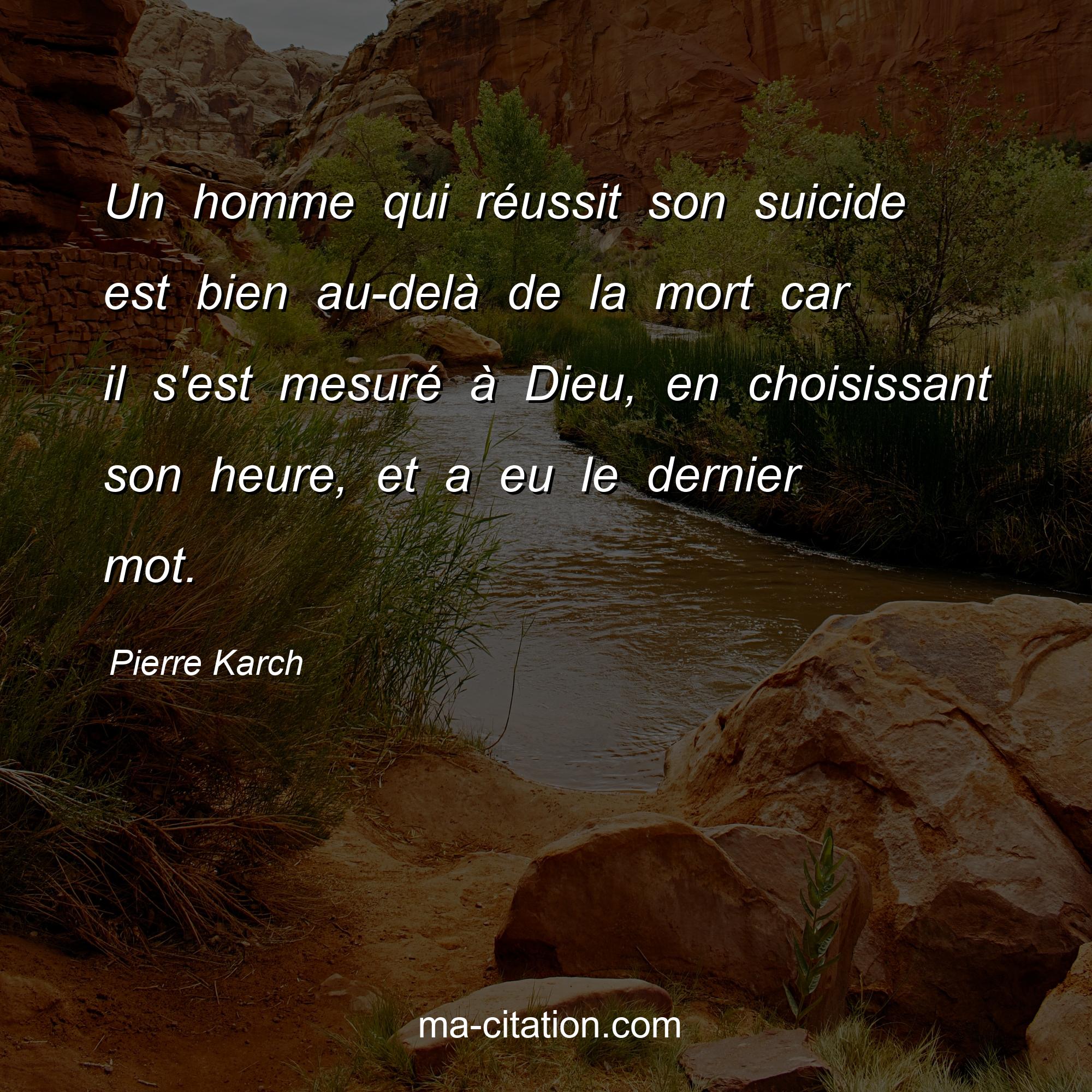 Citation sur la vie de Pierre Karch :Un homme qui réussit son suicide est bien au-delà de la mort car il s'est mesuré à Dieu, en choisissant son heure, et a eu le dernier mot.