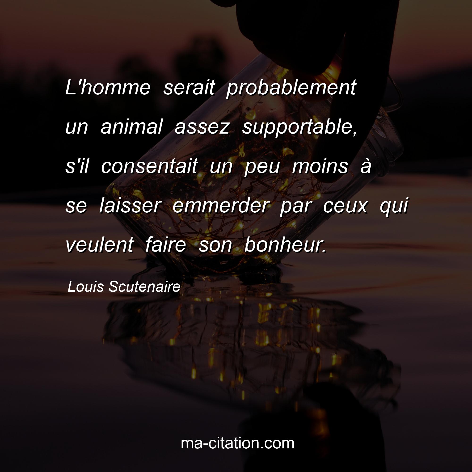 Citation sur la vie de Louis Scutenaire :L'homme serait probablement un animal assez supportable, s'il consentait un peu moins à se laisser emmerder par ceux qui veulent faire son bonheur.