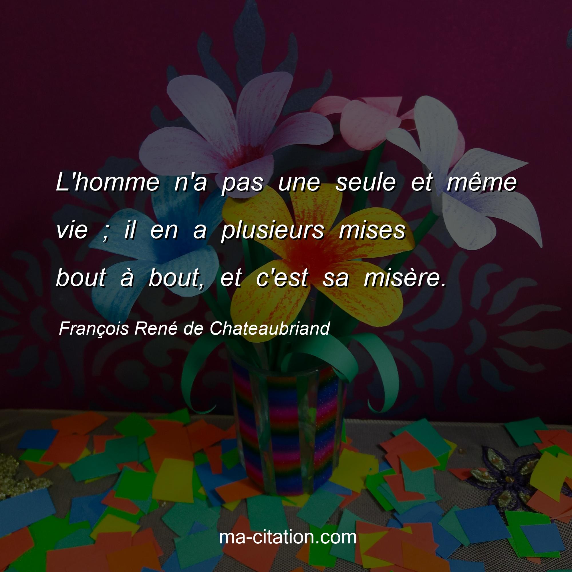 Citation sur la vie de François René de Chateaubriand :L'homme n'a pas une seule et même vie ; il en a plusieurs mises bout à bout, et c'est sa misère.