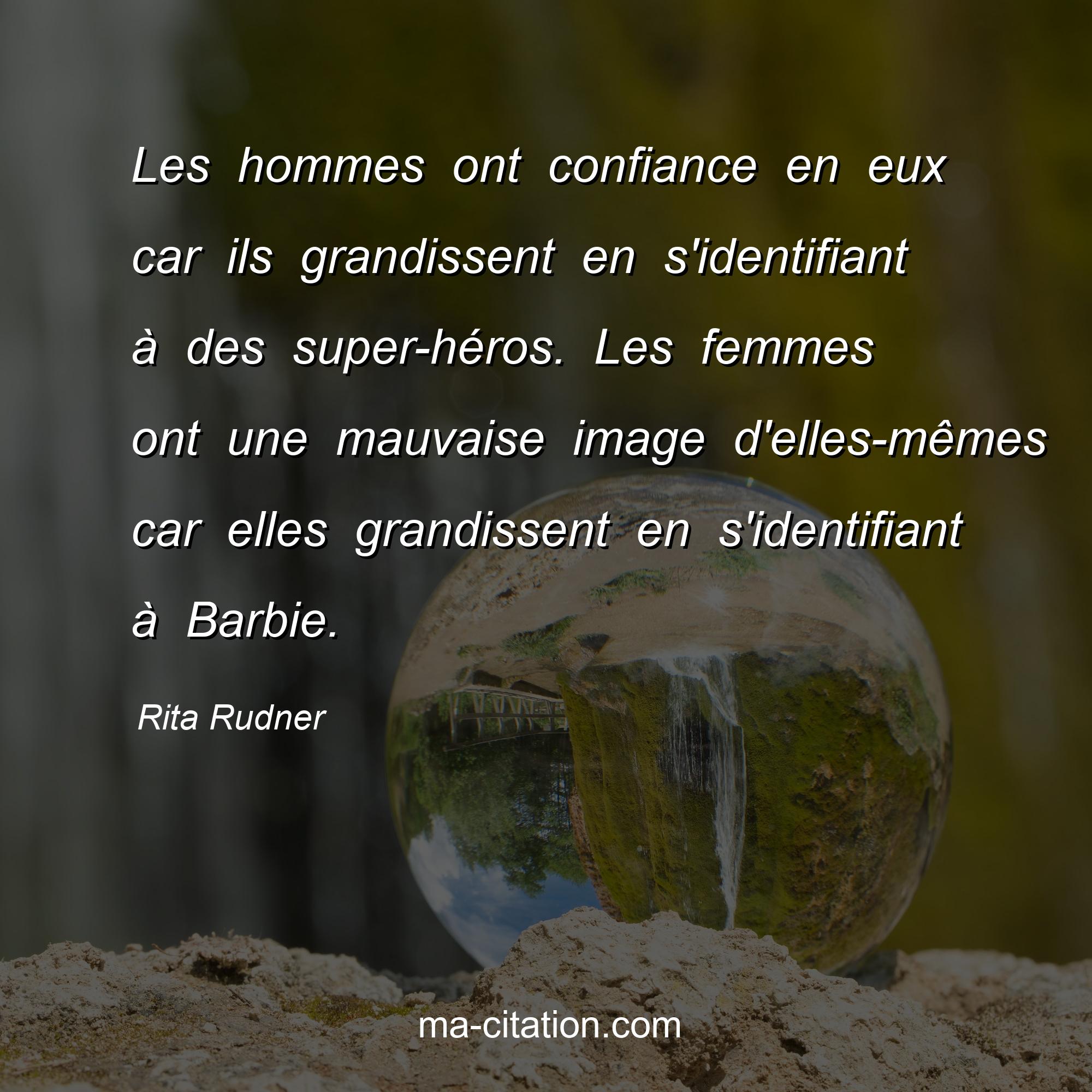 Citation sur la vie de Rita Rudner :Les hommes ont confiance en eux car ils grandissent en s'identifiant à des super-héros. Les femmes ont une mauvaise image d'elles-mêmes car elles grandissent en s'identifiant à Barbie.