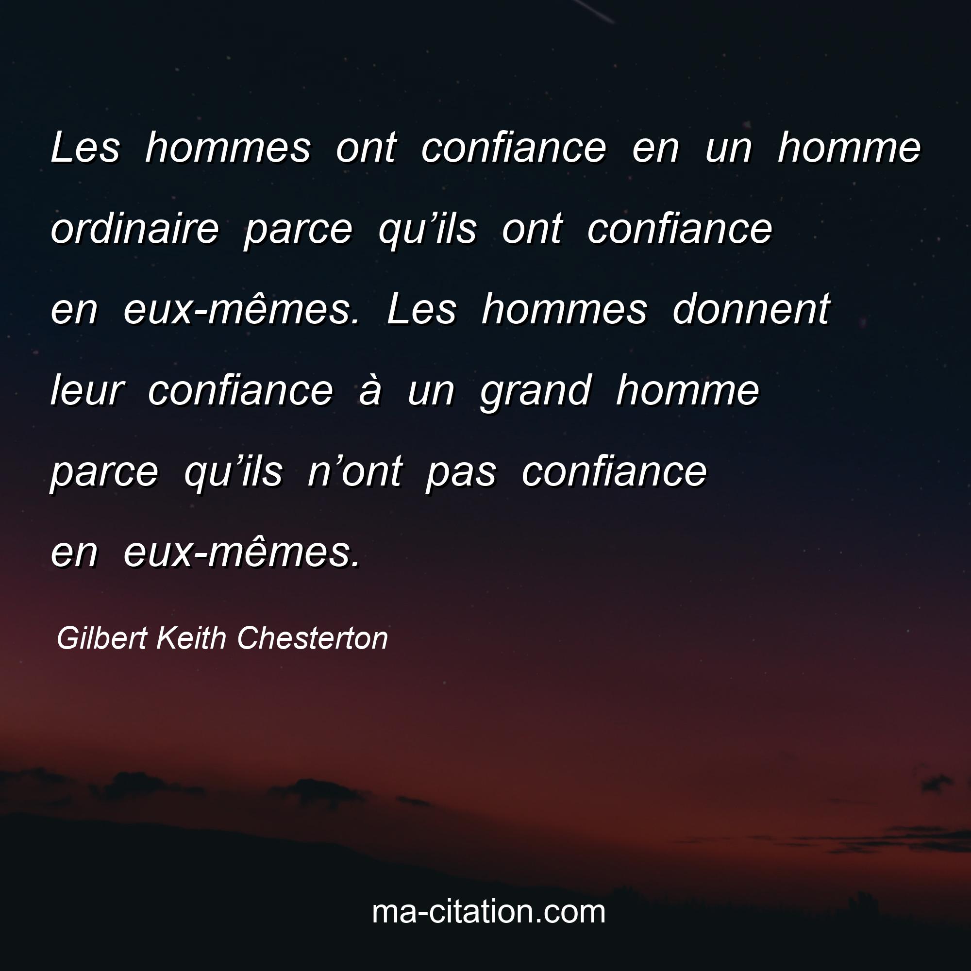 Citation sur la vie de Gilbert Keith Chesterton :Les hommes ont confiance en un homme ordinaire parce qu’ils ont confiance en eux-mêmes. Les hommes donnent leur confiance à un grand homme parce qu’ils n’ont pas confiance en eux-mêmes.