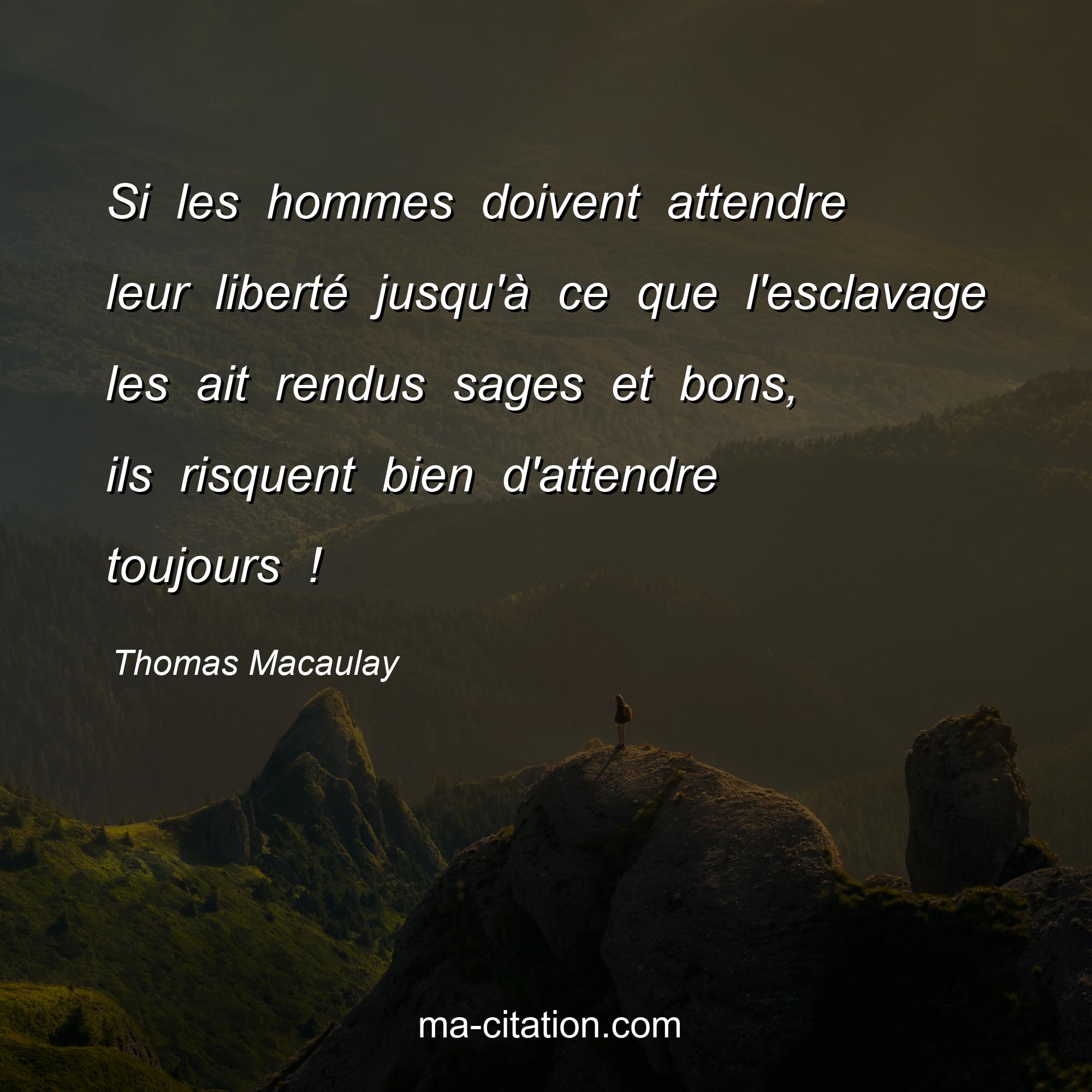 Citation sur la vie de Thomas Macaulay :Si les hommes doivent attendre leur liberté jusqu'à ce que l'esclavage les ait rendus sages et bons, ils risquent bien d'attendre toujours !