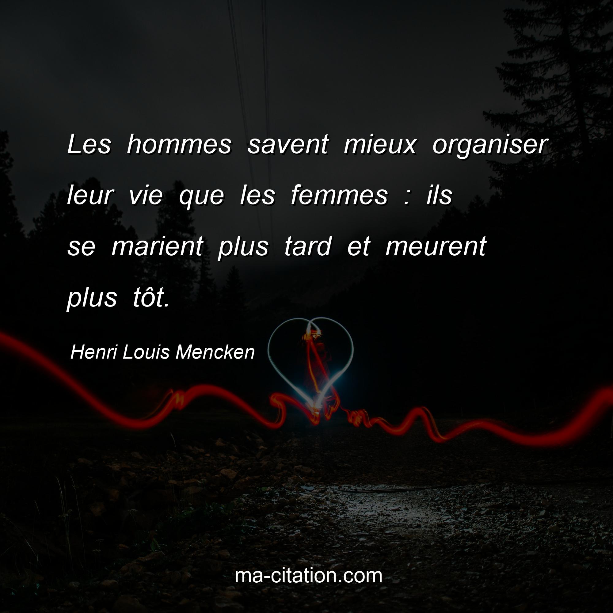 Citation sur la vie de Henri Louis Mencken :Les hommes savent mieux organiser leur vie que les femmes : ils se marient plus tard et meurent plus tôt.