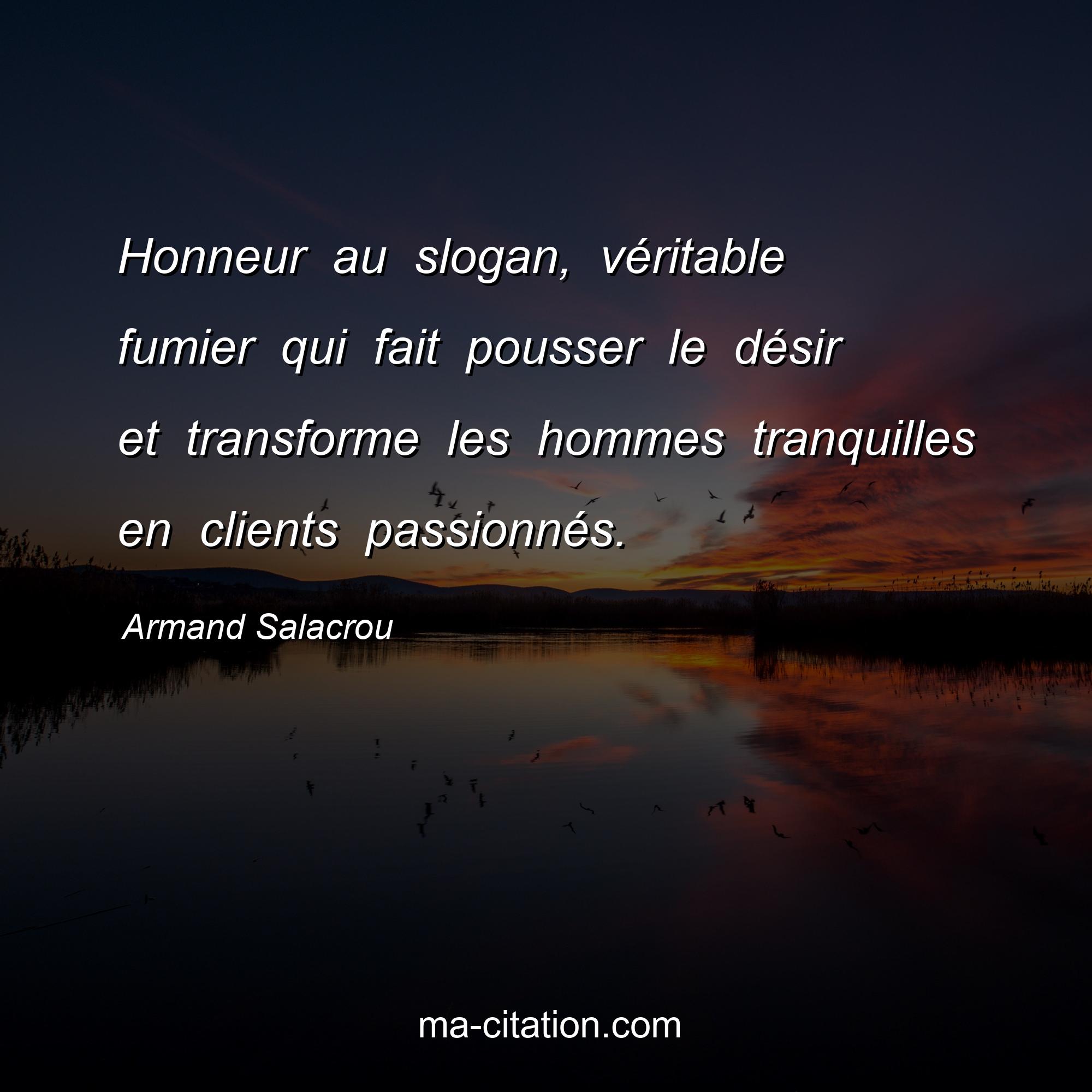 Citation sur la vie d'Armand Salacrou :Honneur au slogan, véritable fumier qui fait pousser le désir et transforme les hommes tranquilles en clients passionnés.