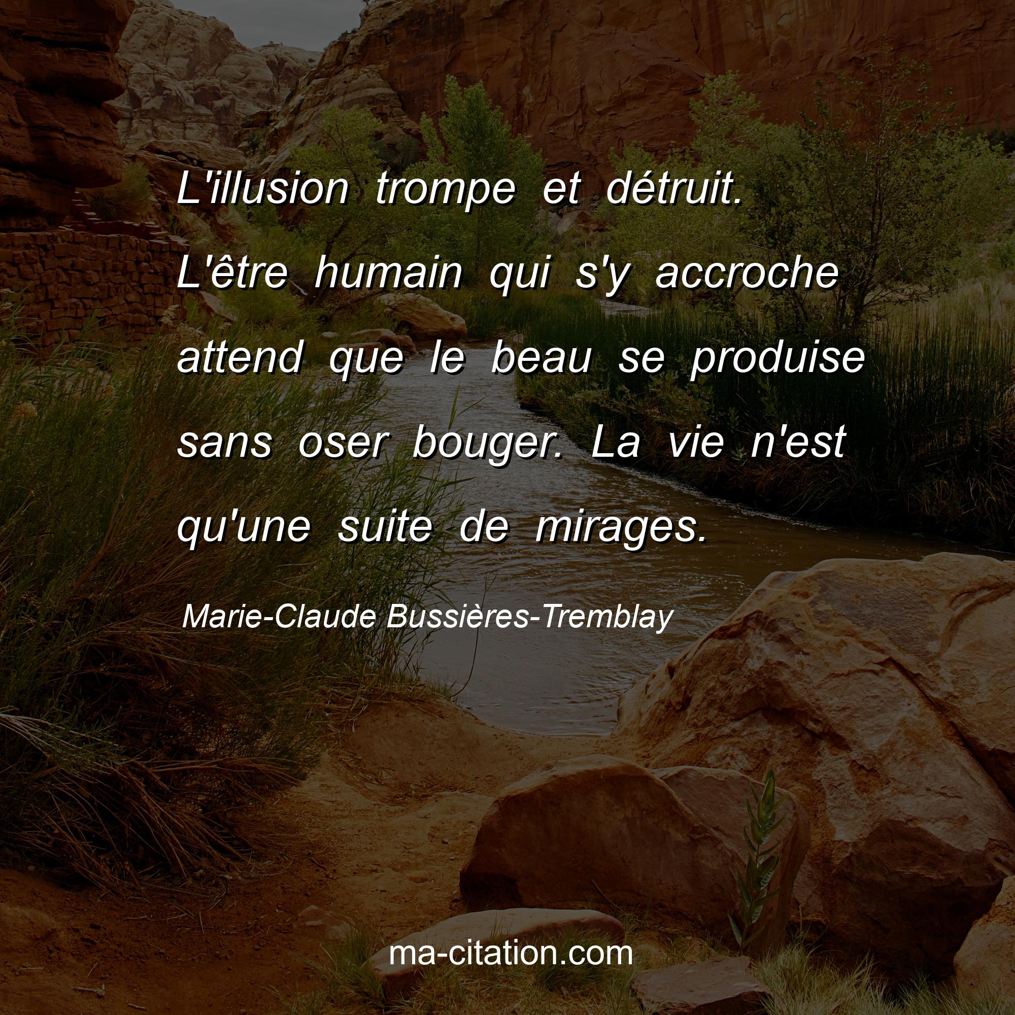 Marie-Claude Bussières-Tremblay est l'auteur de la citation sur la vie "L'illusion trompe et détruit. L'être humain qui s'y accroche attend que le beau se produise sans oser bouger. La vie n'est qu'une suite de mirages.".