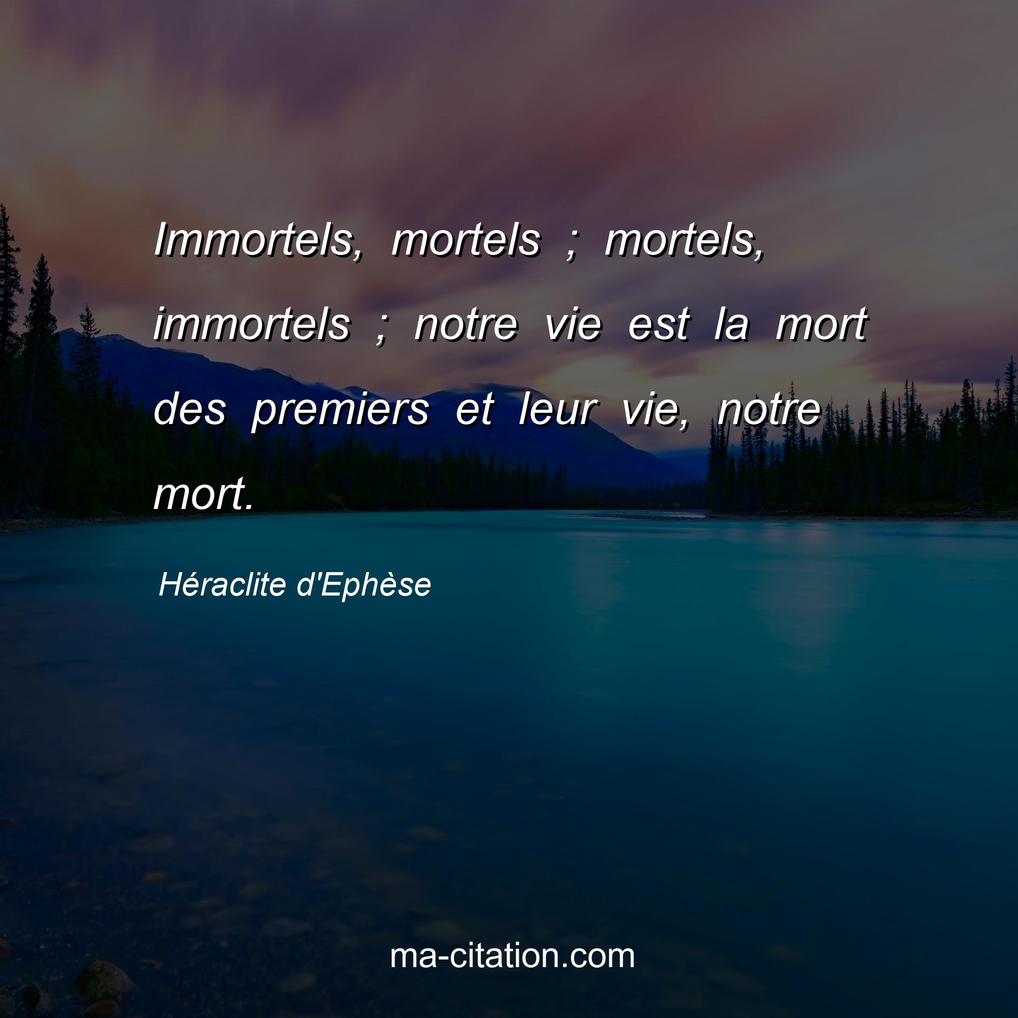 Citation sur la vie de Héraclite d'Ephèse :Immortels, mortels ; mortels, immortels ; notre vie est la mort des premiers et leur vie, notre mort.