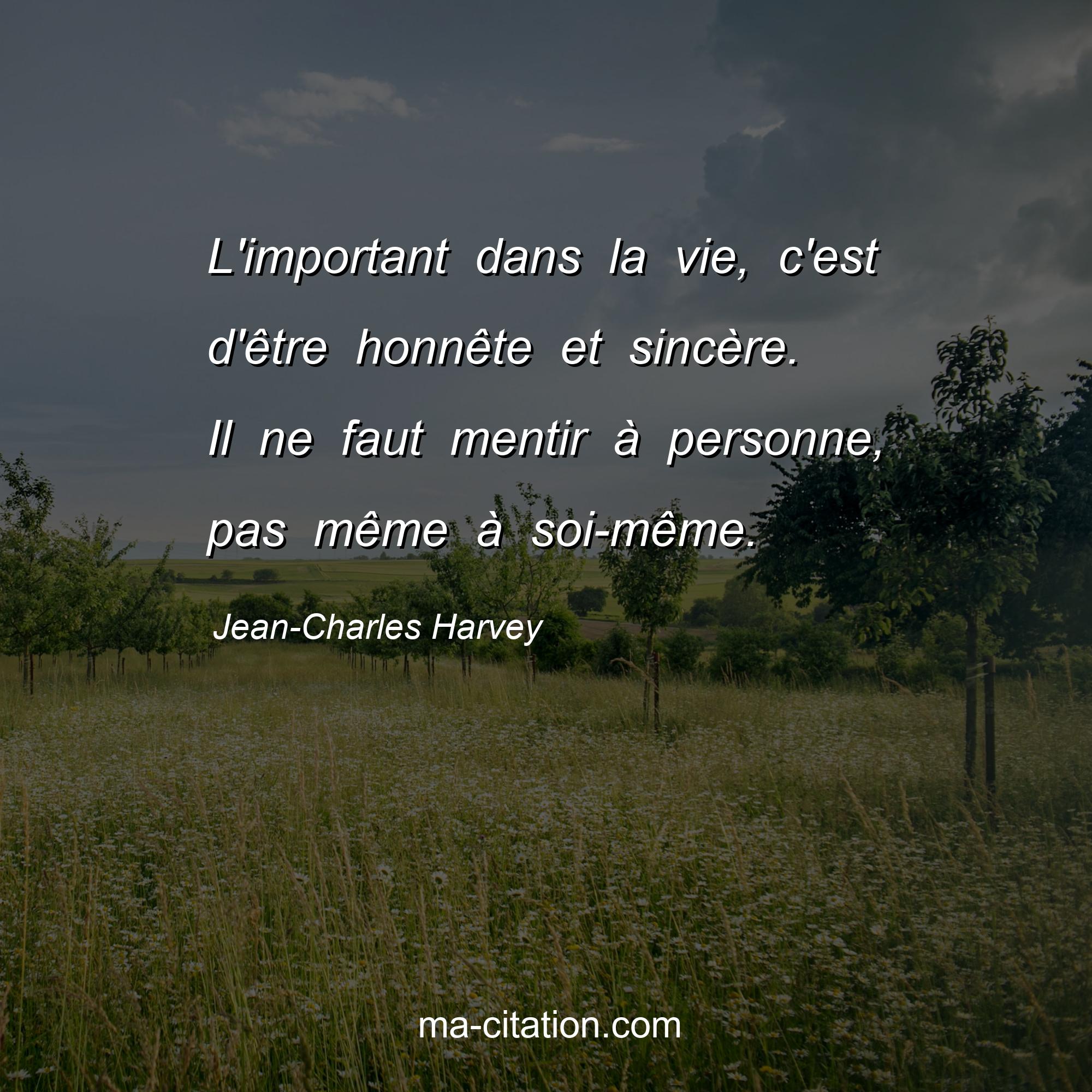 Jean-Charles Harvey est l'auteur de la citation sur la vie "L'important dans la vie, c'est d'être honnête et sincère. Il ne faut mentir à personne, pas même à soi-même.".