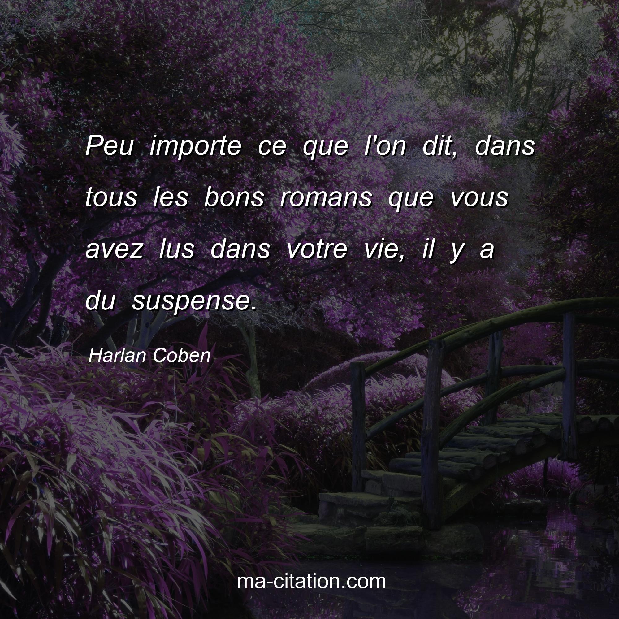 Citation sur la vie de Harlan Coben :Peu importe ce que l'on dit, dans tous les bons romans que vous avez lus dans votre vie, il y a du suspense.