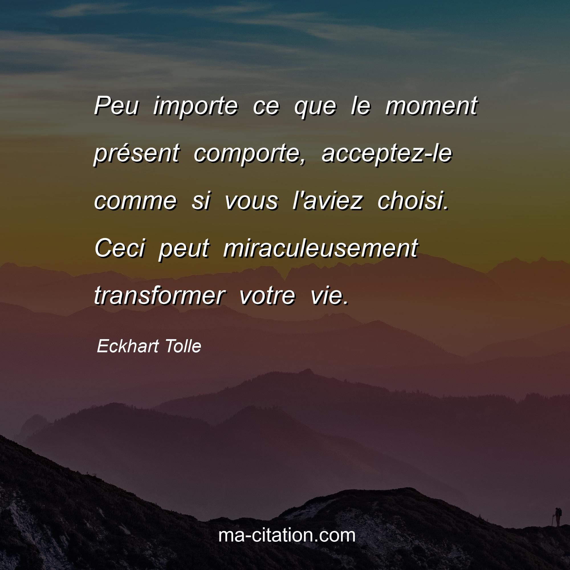 Citation sur la vie d'Eckhart Tolle :Peu importe ce que le moment présent comporte, acceptez-le comme si vous l'aviez choisi. Ceci peut miraculeusement transformer votre vie.