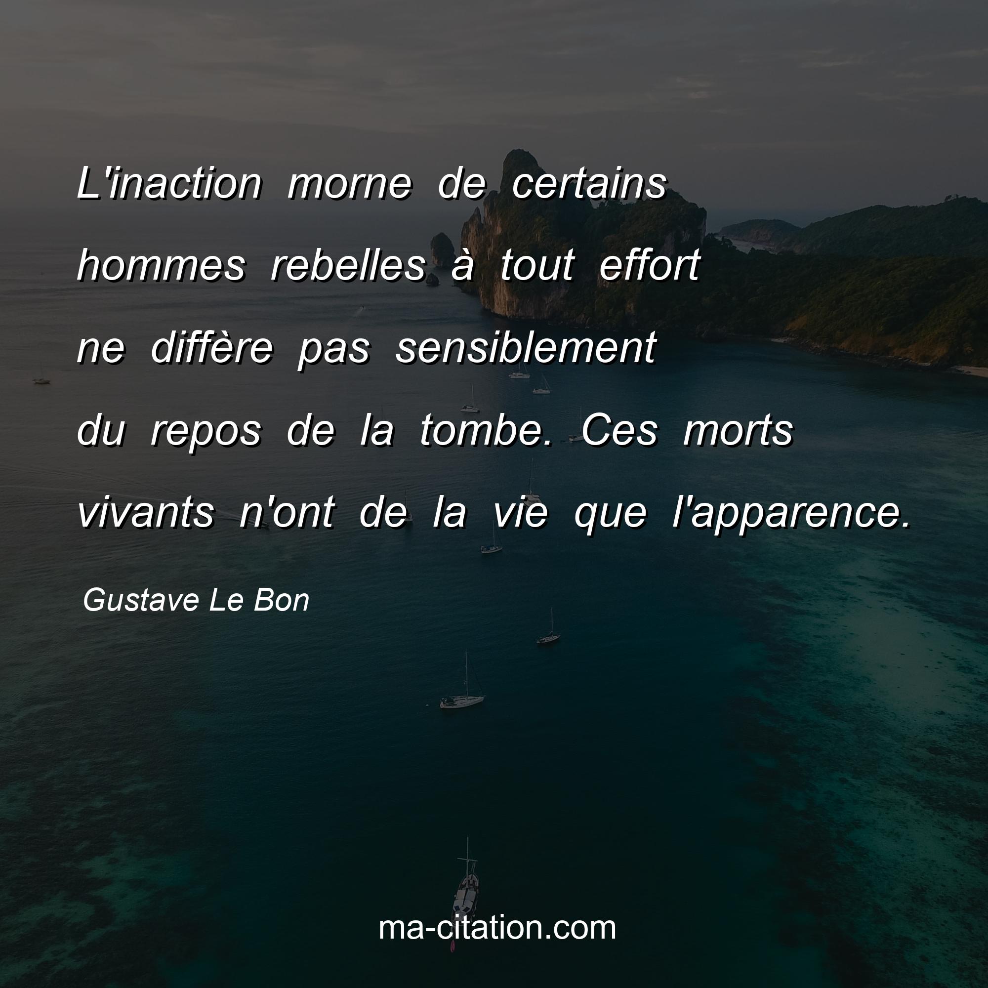 Citation sur la vie de Gustave Le Bon :L'inaction morne de certains hommes rebelles à tout effort ne diffère pas sensiblement du repos de la tombe. Ces morts vivants n'ont de la vie que l'apparence.