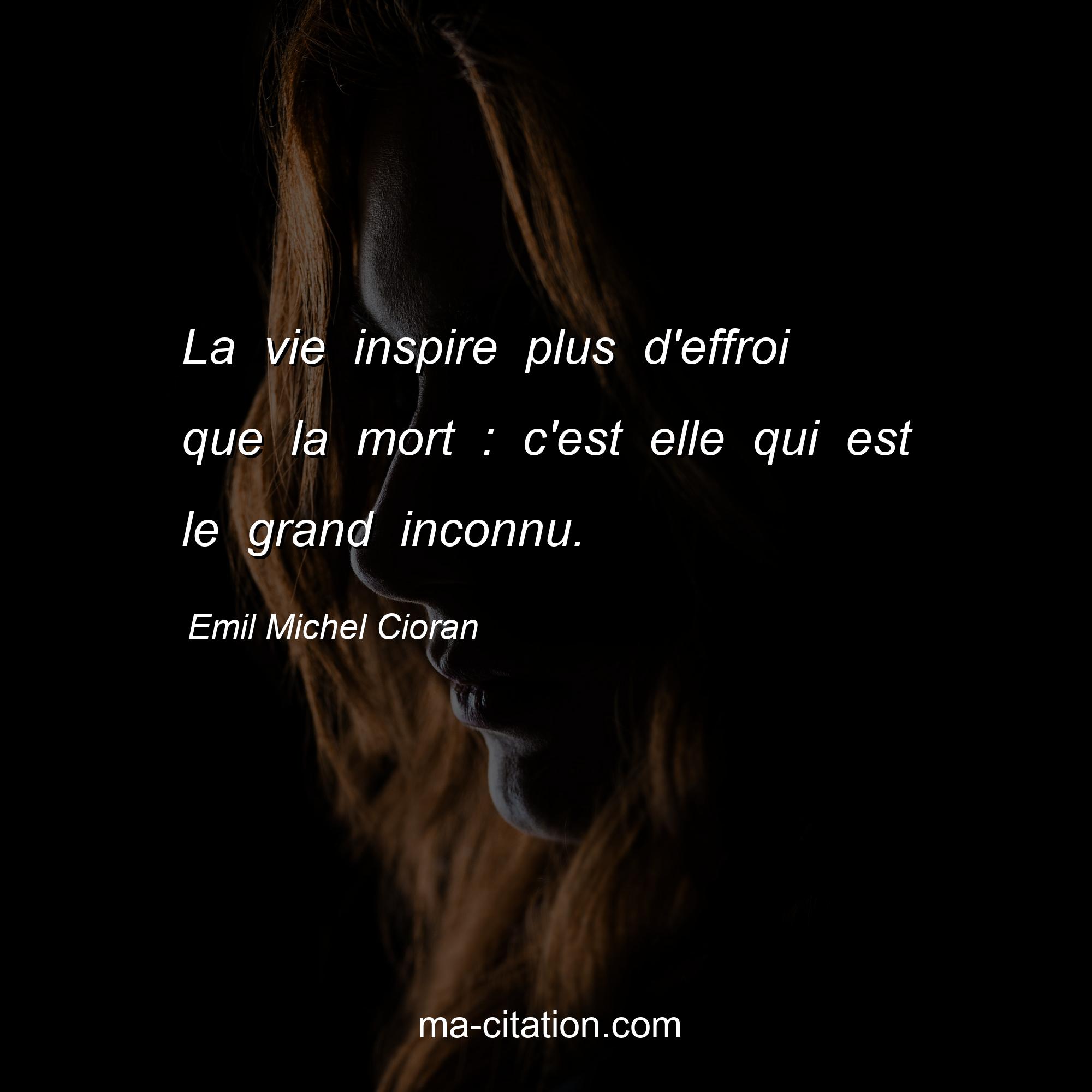 Citation sur la vie d'Emil Michel Cioran :La vie inspire plus d'effroi que la mort : c'est elle qui est le grand inconnu.