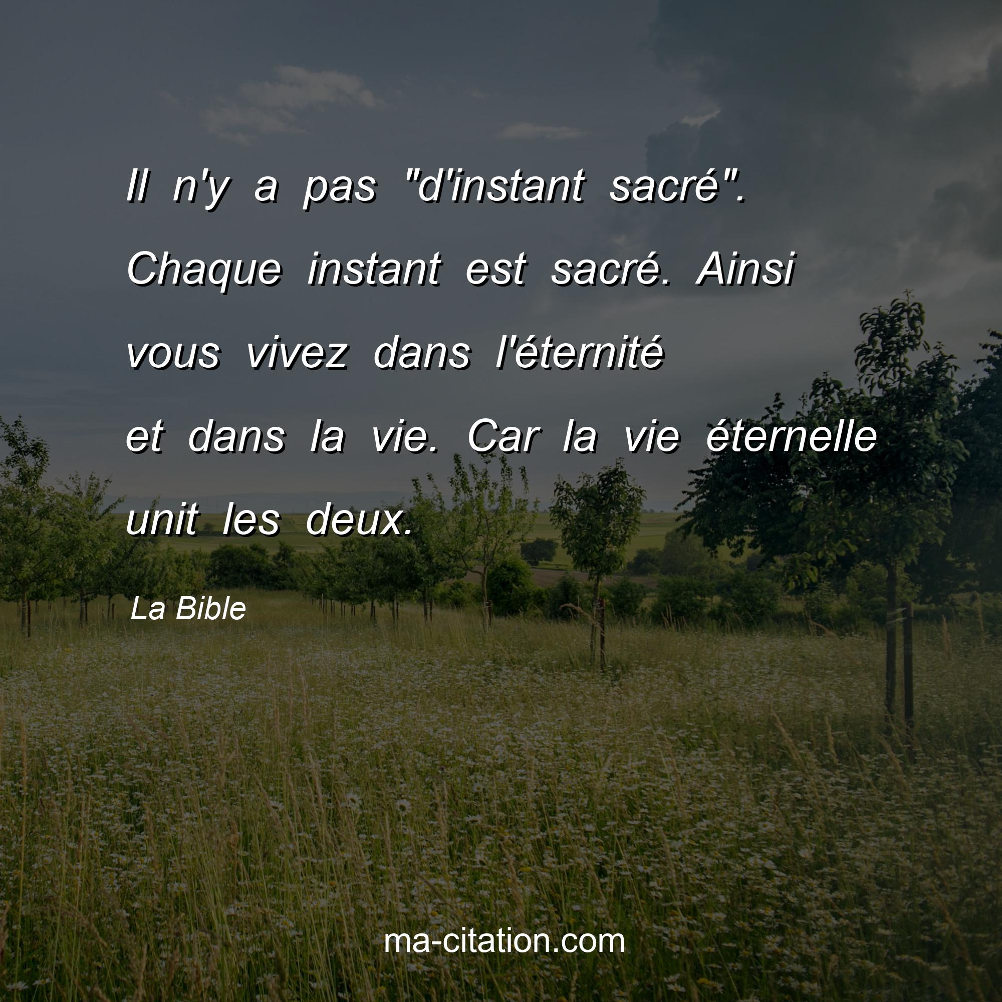 Citation sur la vie de La Bible :Il n'y a pas "d'instant sacré". Chaque instant est sacré. Ainsi vous vivez dans l'éternité et dans la vie. Car la vie éternelle unit les deux.