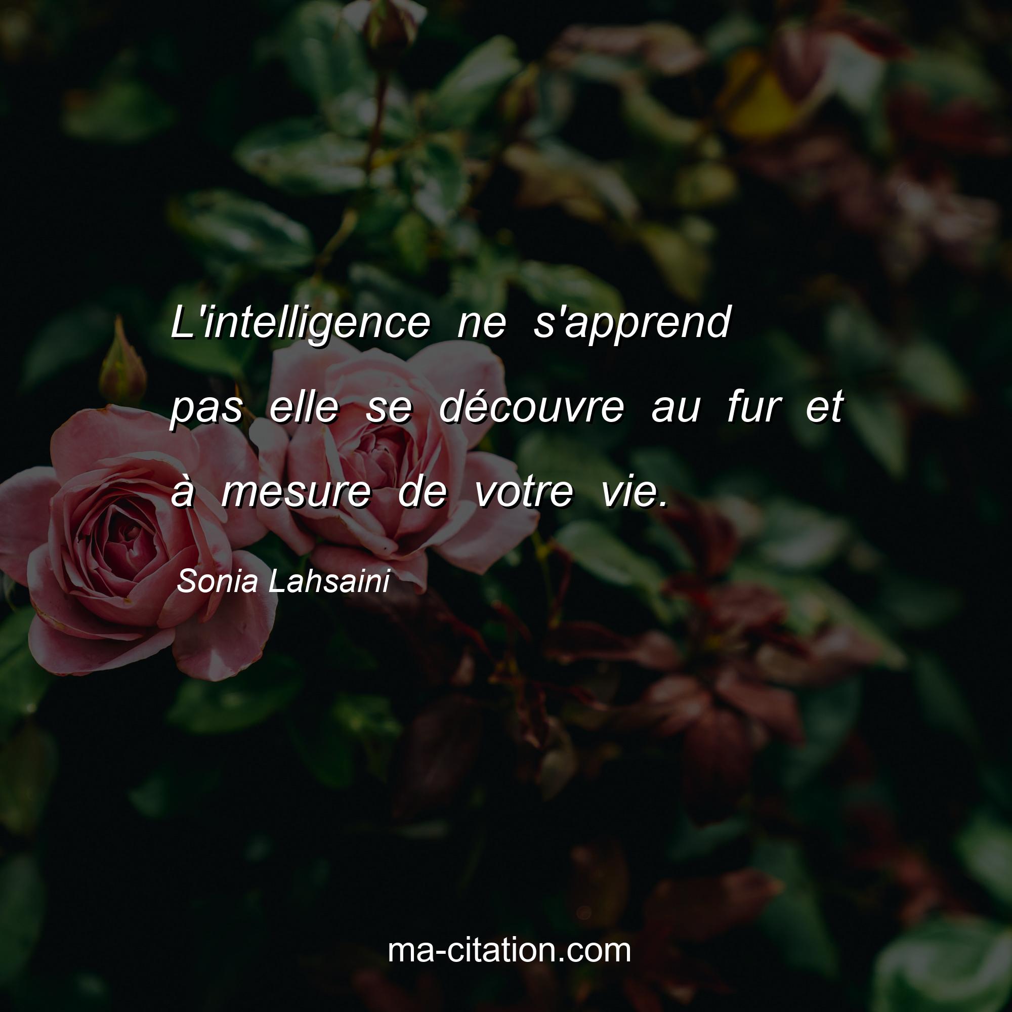 Citation sur la vie de Sonia Lahsaini :L'intelligence ne s'apprend pas elle se découvre au fur et à mesure de votre vie.