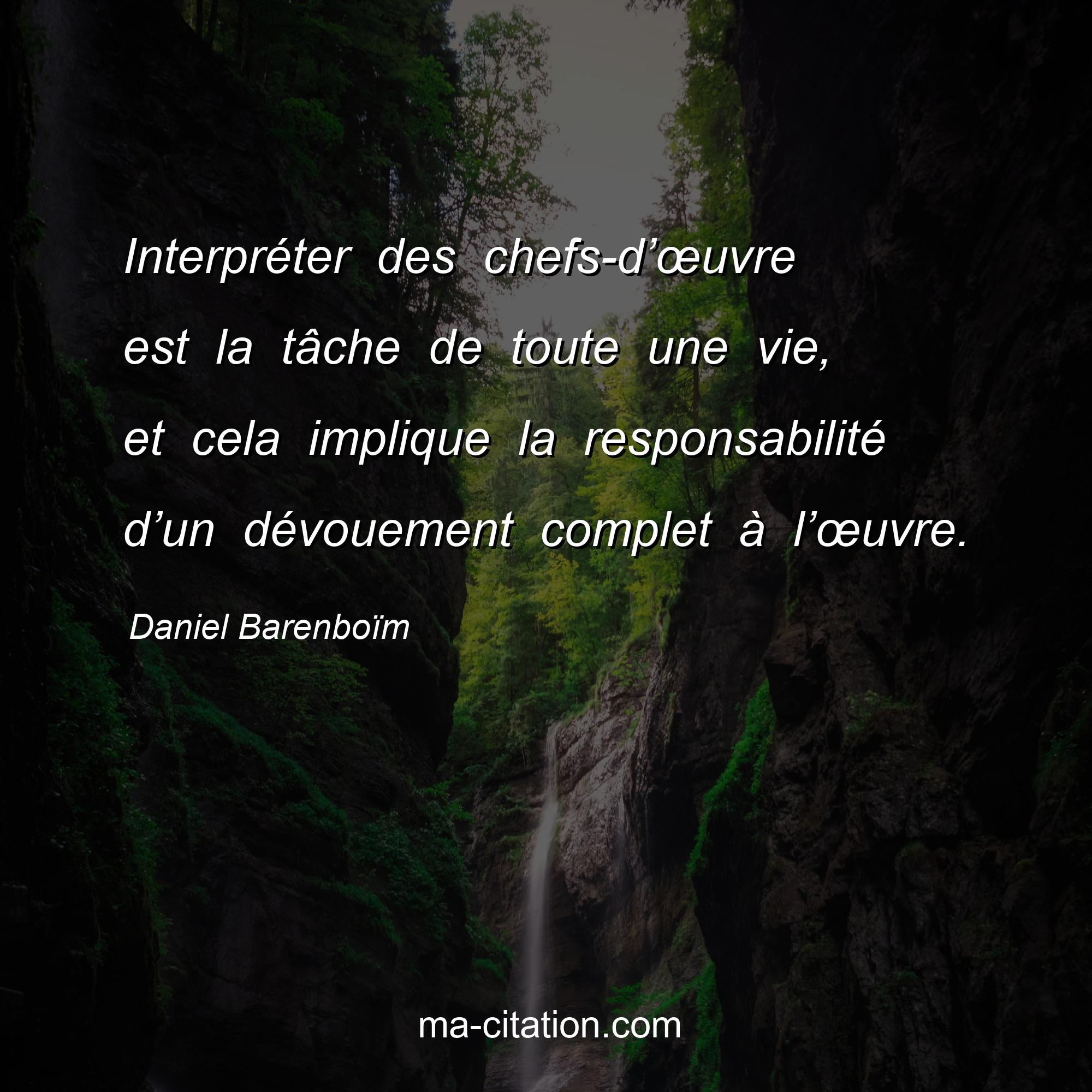 Citation sur la vie de Daniel Barenboïm :Interpréter des chefs-d’œuvre est la tâche de toute une vie, et cela implique la responsabilité d’un dévouement complet à l’œuvre.