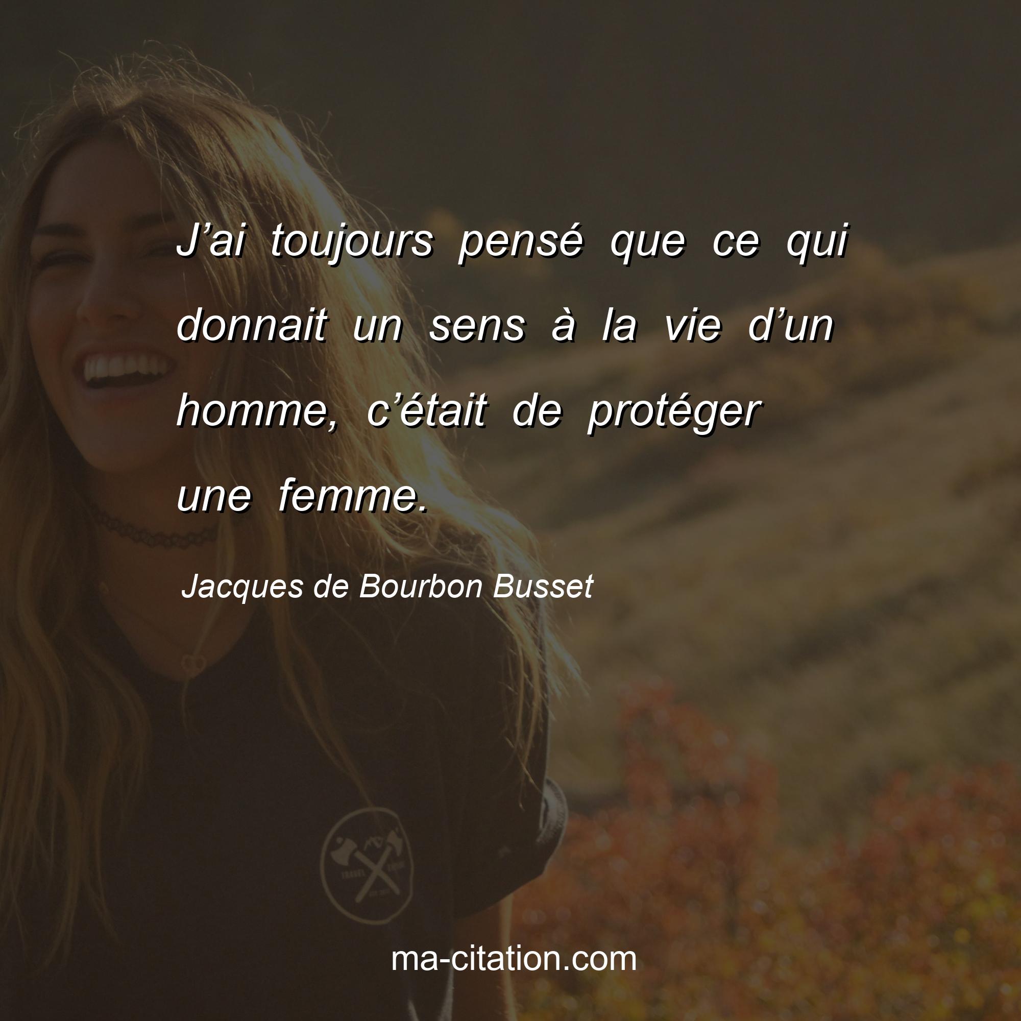 Citation sur la vie de Jacques de Bourbon Busset :J’ai toujours pensé que ce qui donnait un sens à la vie d’un homme, c’était de protéger une femme.