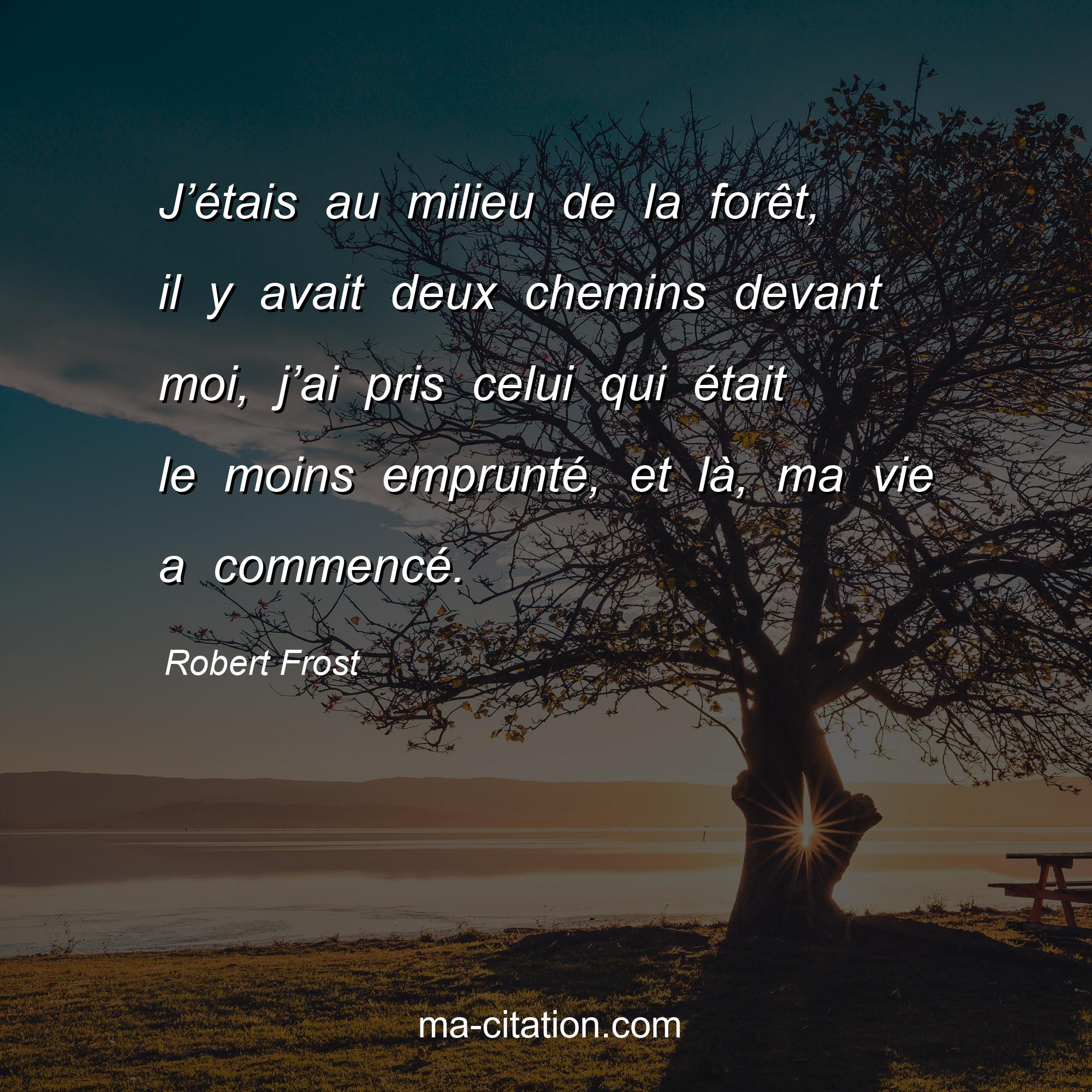 Citation sur la vie de Robert Frost :J’étais au milieu de la forêt, il y avait deux chemins devant moi, j’ai pris celui qui était le moins emprunté, et là , ma vie a commencé.
