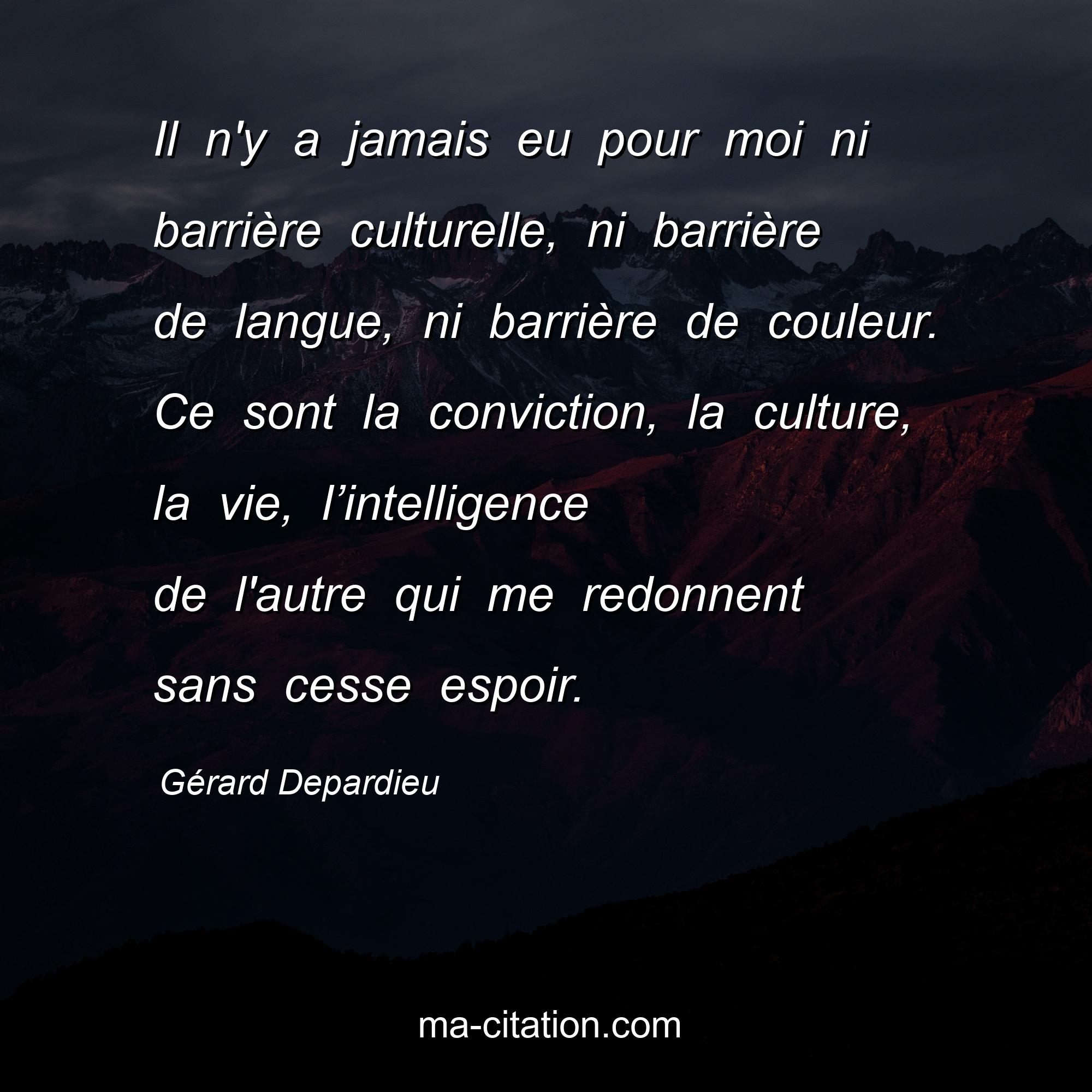 Citation sur la vie de Gérard Depardieu :Il n'y a jamais eu pour moi ni barrière culturelle, ni barrière de langue, ni barrière de couleur. Ce sont la conviction, la culture, la vie, l’intelligence de l'autre qui me redonnent sans cesse espoir.