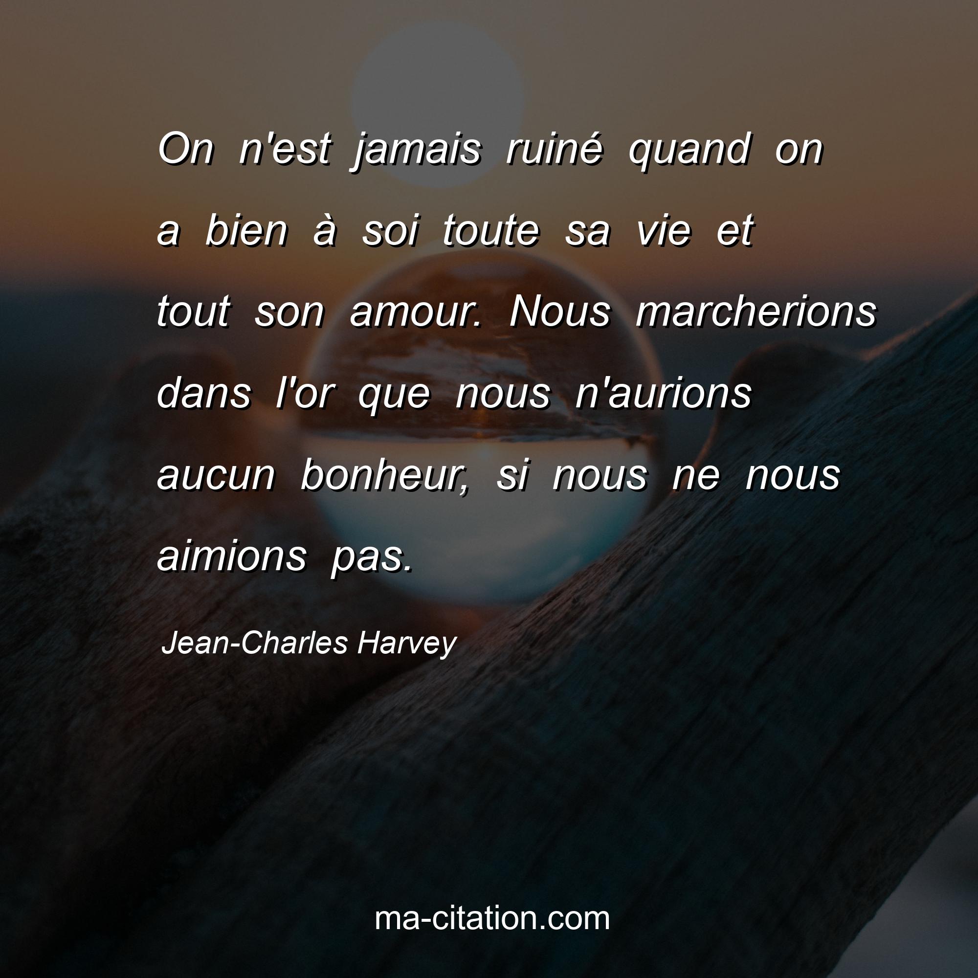 Citation sur la vie de Jean-Charles Harvey :On n'est jamais ruiné quand on a bien à soi toute sa vie et tout son amour. Nous marcherions dans l'or que nous n'aurions aucun bonheur, si nous ne nous aimions pas.