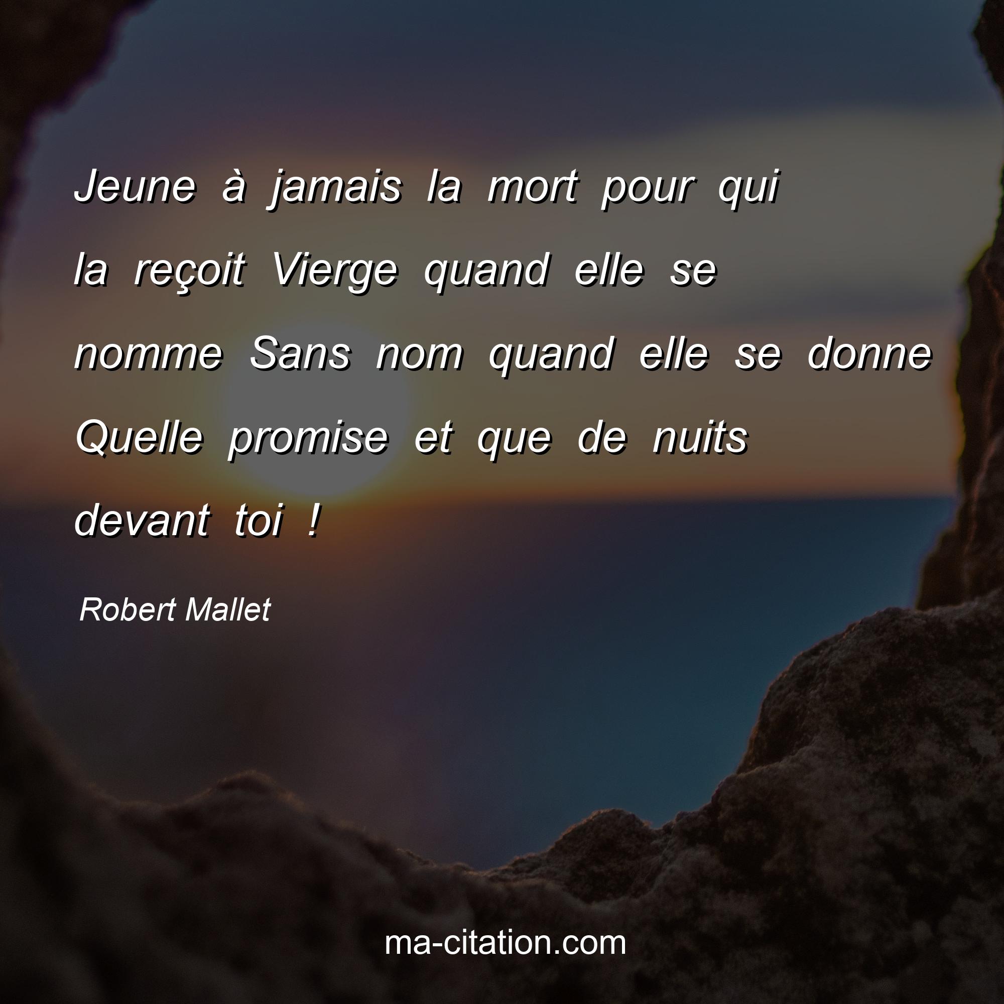 Citation sur la vie de Robert Mallet :Jeune à jamais la mort pour qui la reçoit Vierge quand elle se nomme Sans nom quand elle se donne Quelle promise et que de nuits devant toi !
