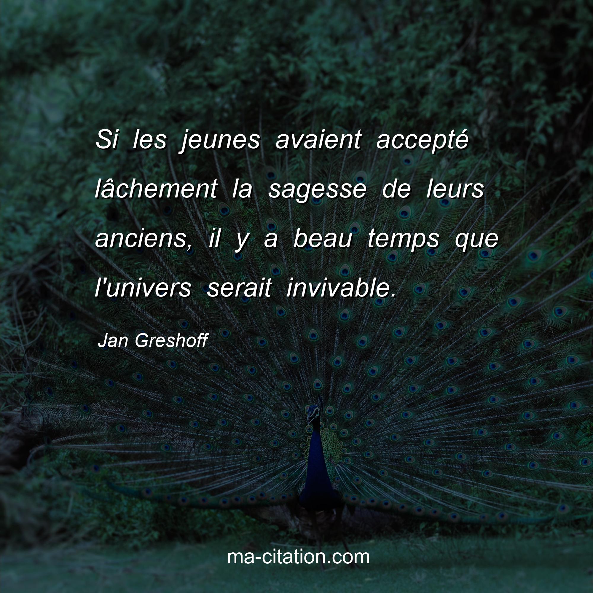 Citation sur la vie de Jan Greshoff :Si les jeunes avaient accepté lâchement la sagesse de leurs anciens, il y a beau temps que l'univers serait invivable.