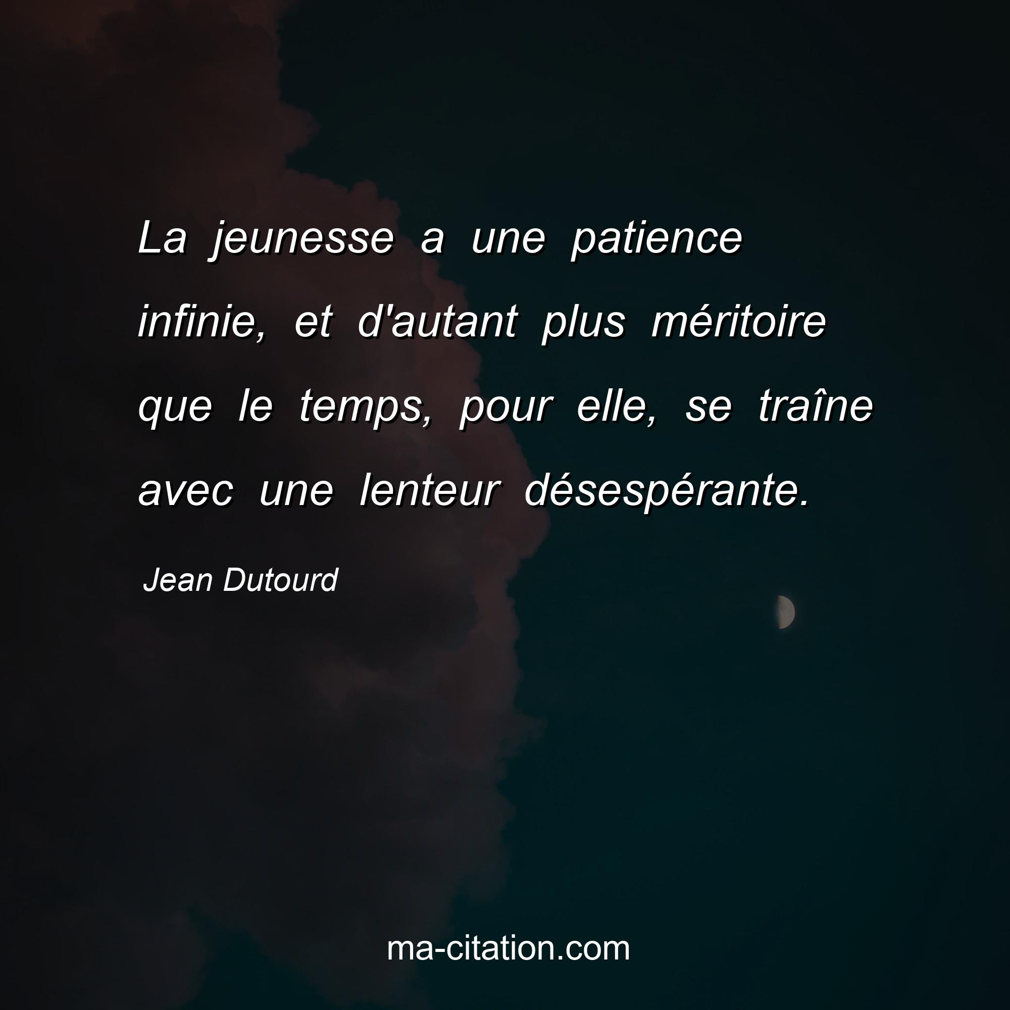 Citation sur la vie de Jean Dutourd :La jeunesse a une patience infinie, et d'autant plus méritoire que le temps, pour elle, se traîne avec une lenteur désespérante.