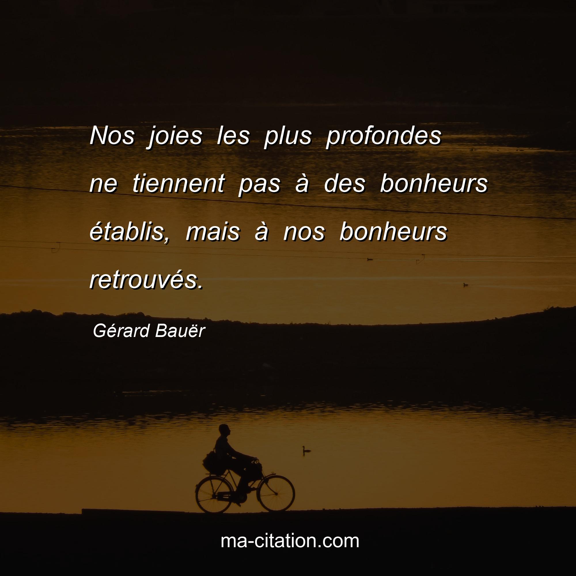 Gérard Bauër est l'auteur de la citation sur la vie "Nos joies les plus profondes ne tiennent pas à des bonheurs établis, mais à nos bonheurs retrouvés.".