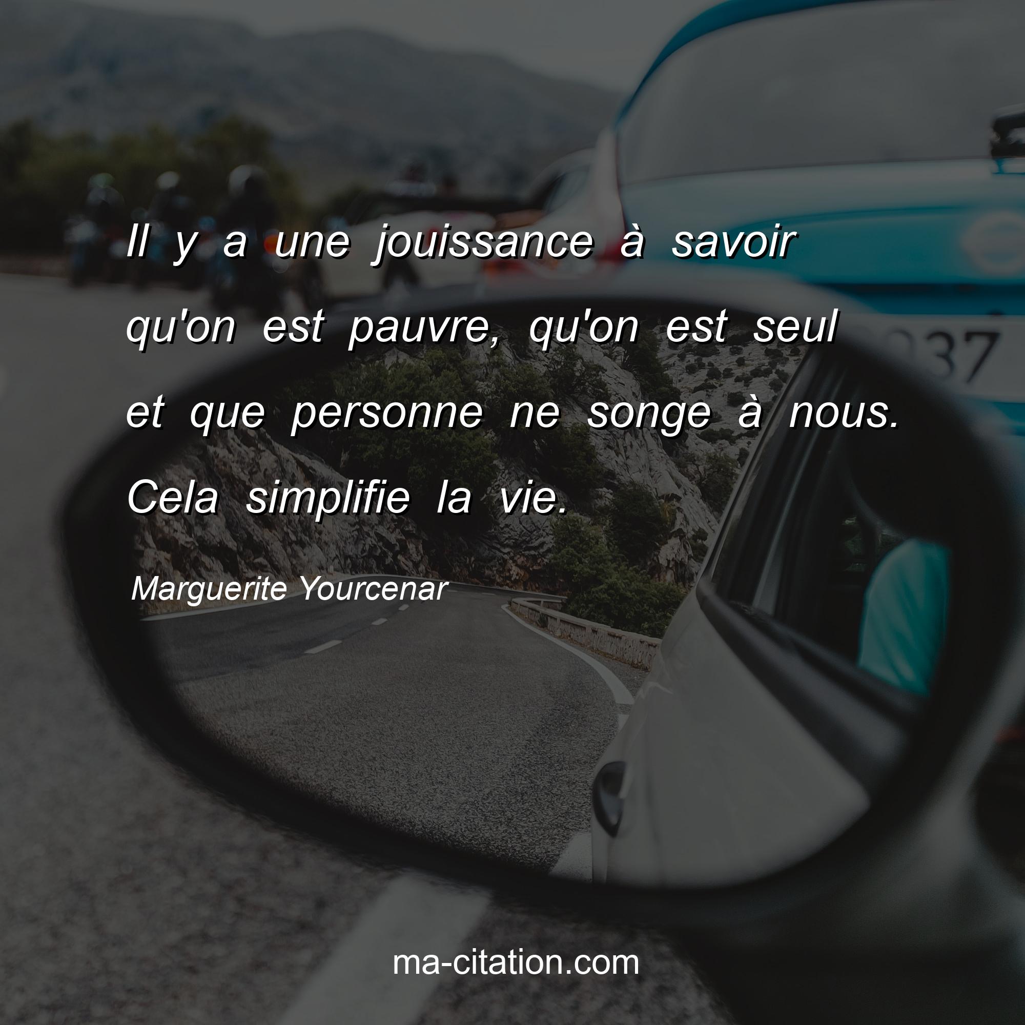 Citation sur la vie de Marguerite Yourcenar :Il y a une jouissance à savoir qu'on est pauvre, qu'on est seul et que personne ne songe à nous. Cela simplifie la vie.