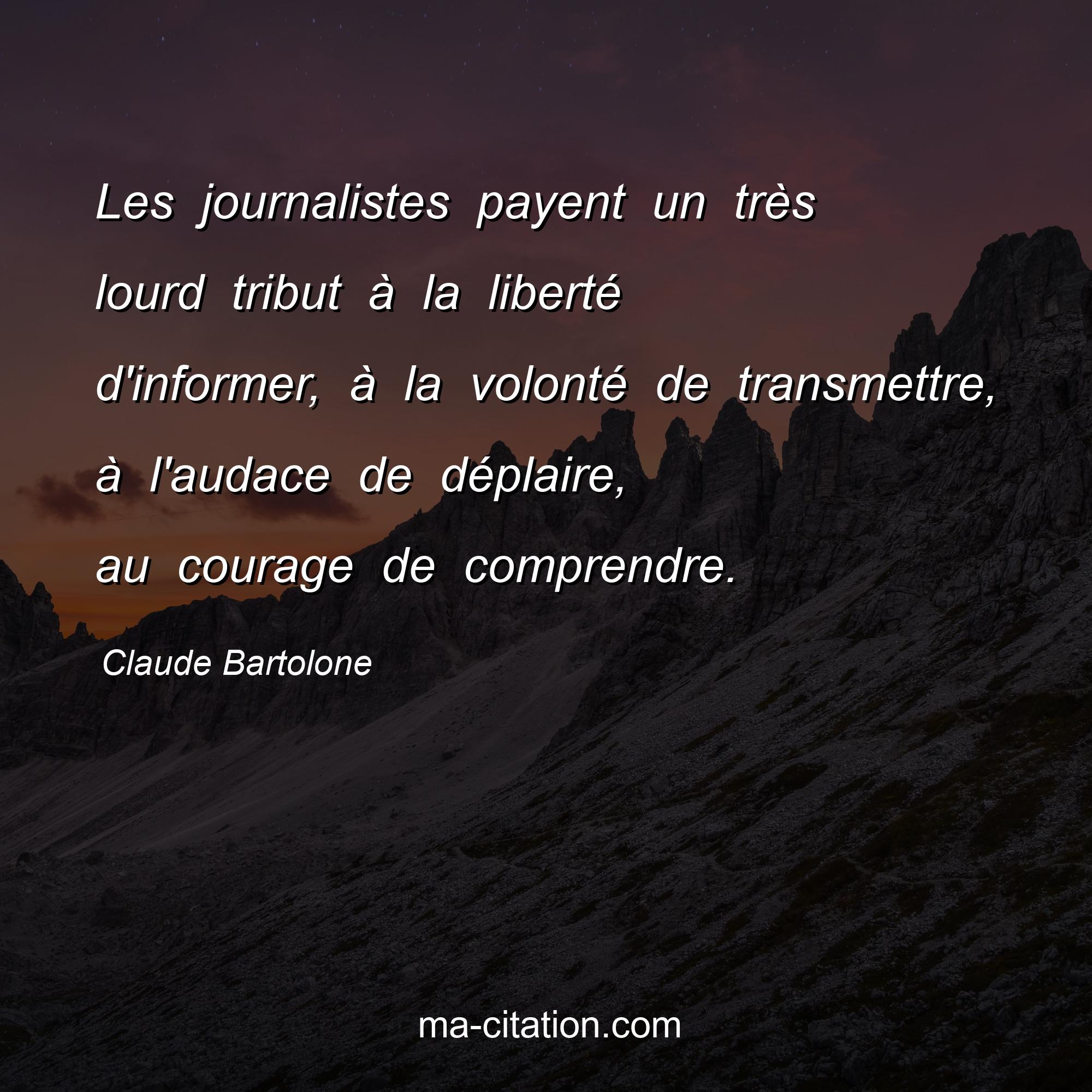 Citation sur la vie de Claude Bartolone :Les journalistes payent un très lourd tribut à la liberté d'informer, à la volonté de transmettre, à l'audace de déplaire, au courage de comprendre.