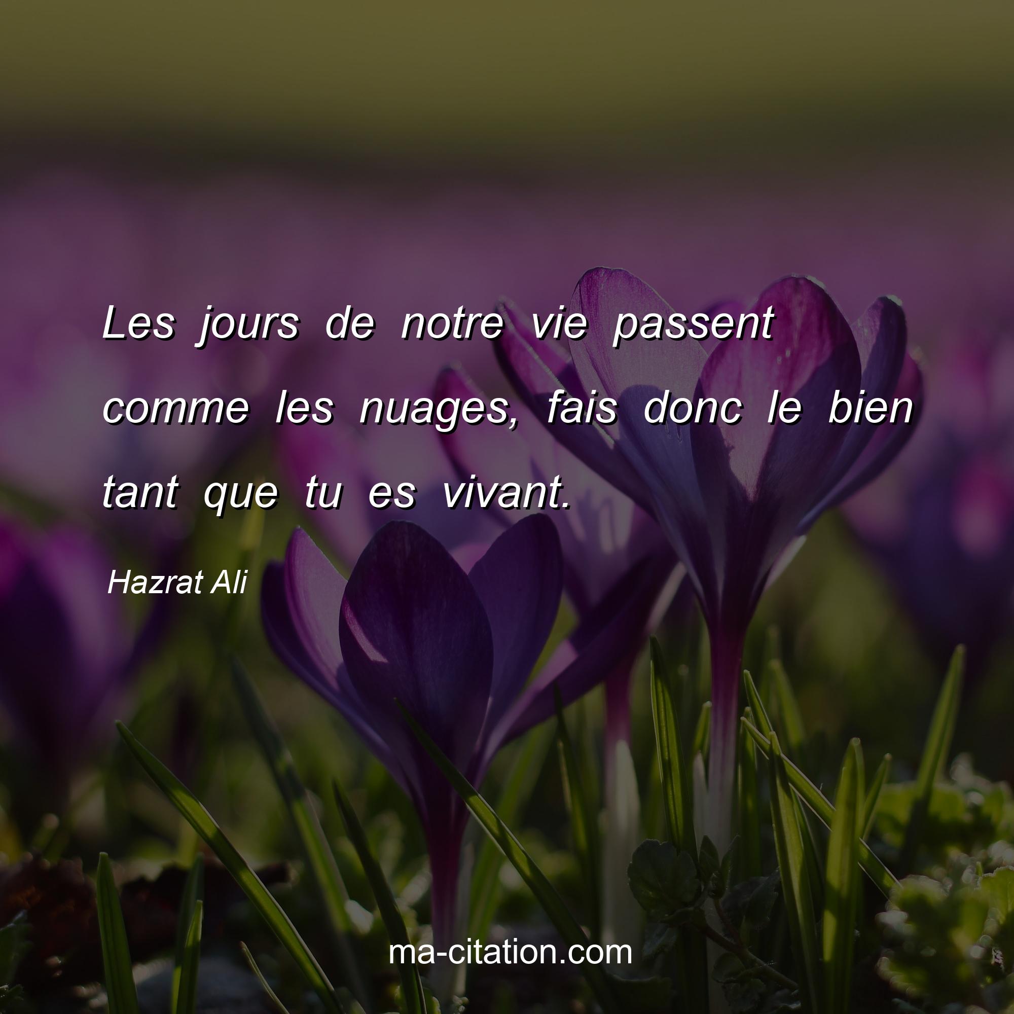 Hazrat Ali est l'auteur de la citation sur la vie "Les jours de notre vie passent comme les nuages, fais donc le bien tant que tu es vivant.".