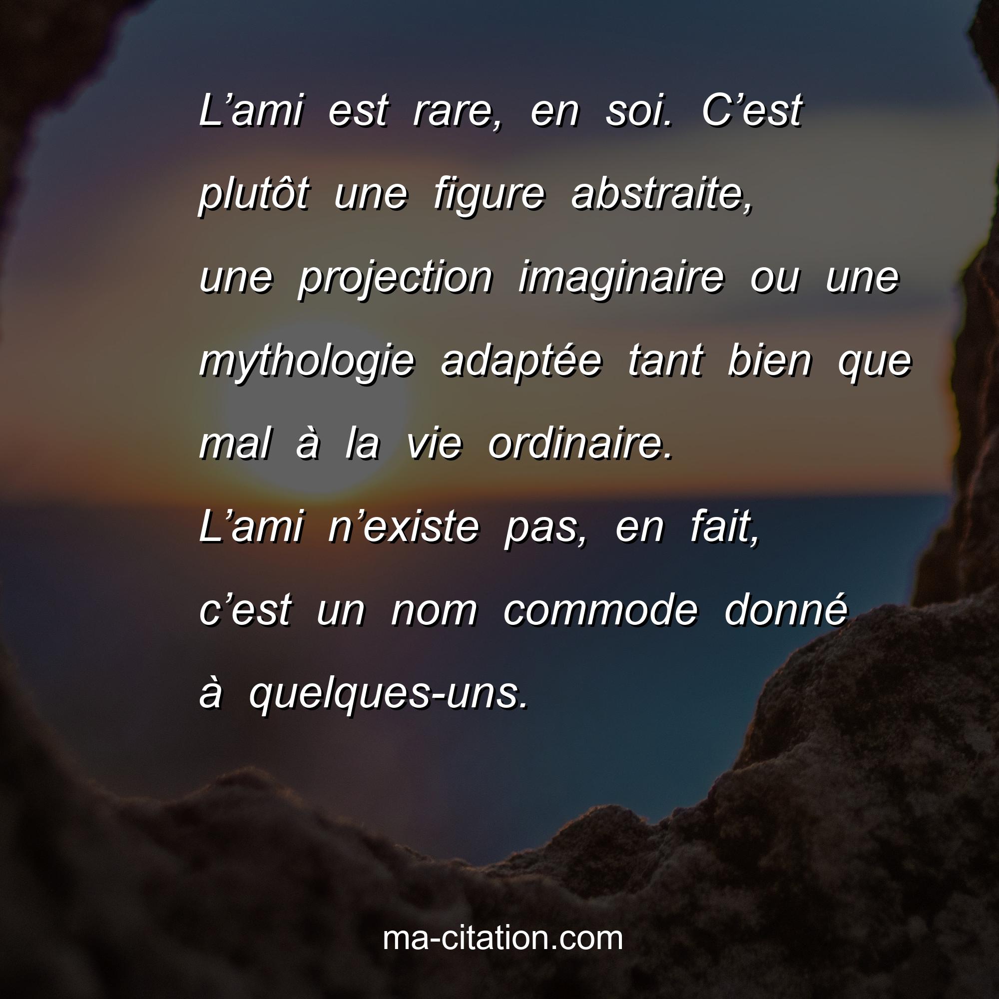 L’ami est rare, en soi. C’est plutôt une figure abstraite, une projection imaginaire ou une mythologie adaptée tant bien que mal à la vie ordinaire. L’ami n’existe pas, en fait, c’est un nom commode donné à quelques-uns.