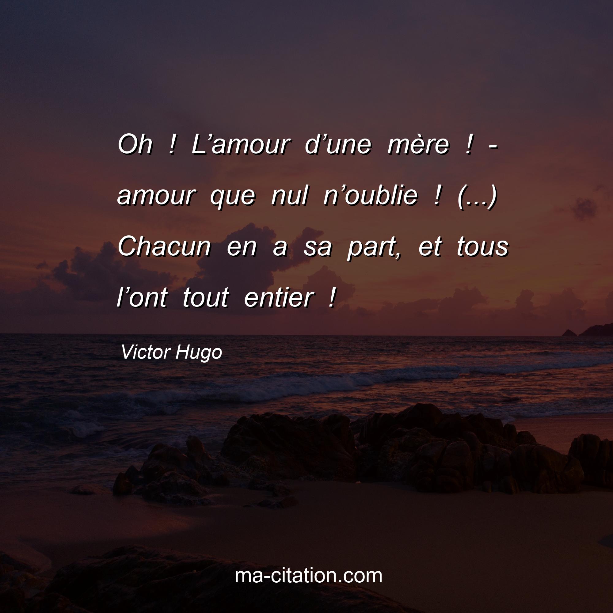 Citation sur la vie de Victor Hugo :Oh ! L’amour d’une mère ! - amour que nul n’oublie ! (...) Chacun en a sa part, et tous l’ont tout entier !