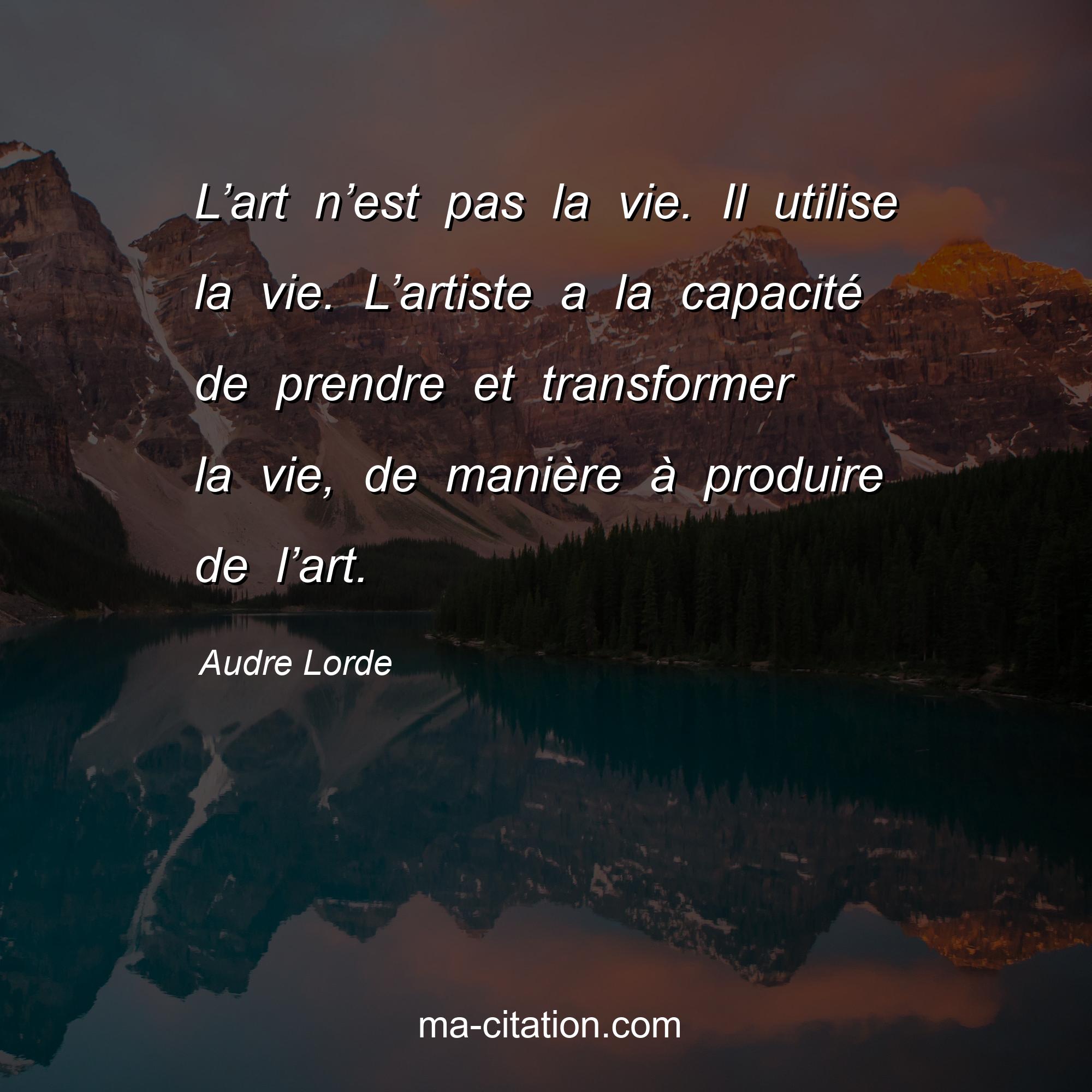 Citation sur la vie d'Audre Lorde :L’art n’est pas la vie. Il utilise la vie. L’artiste a la capacité de prendre et transformer la vie, de manière à produire de l’art.