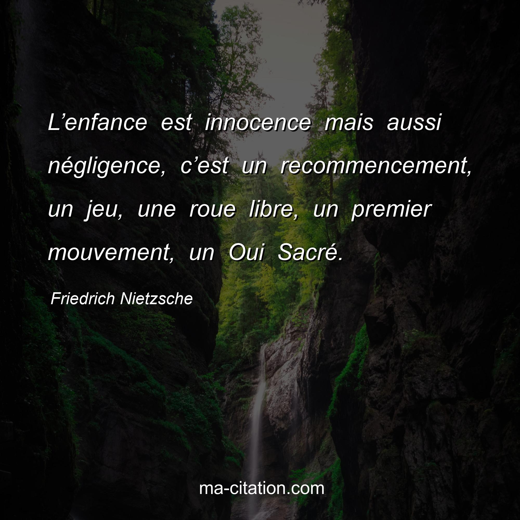 Citation sur la vie de Friedrich Nietzsche :L’enfance est innocence mais aussi négligence, c’est un recommencement, un jeu, une roue libre, un premier mouvement, un Oui Sacré.
