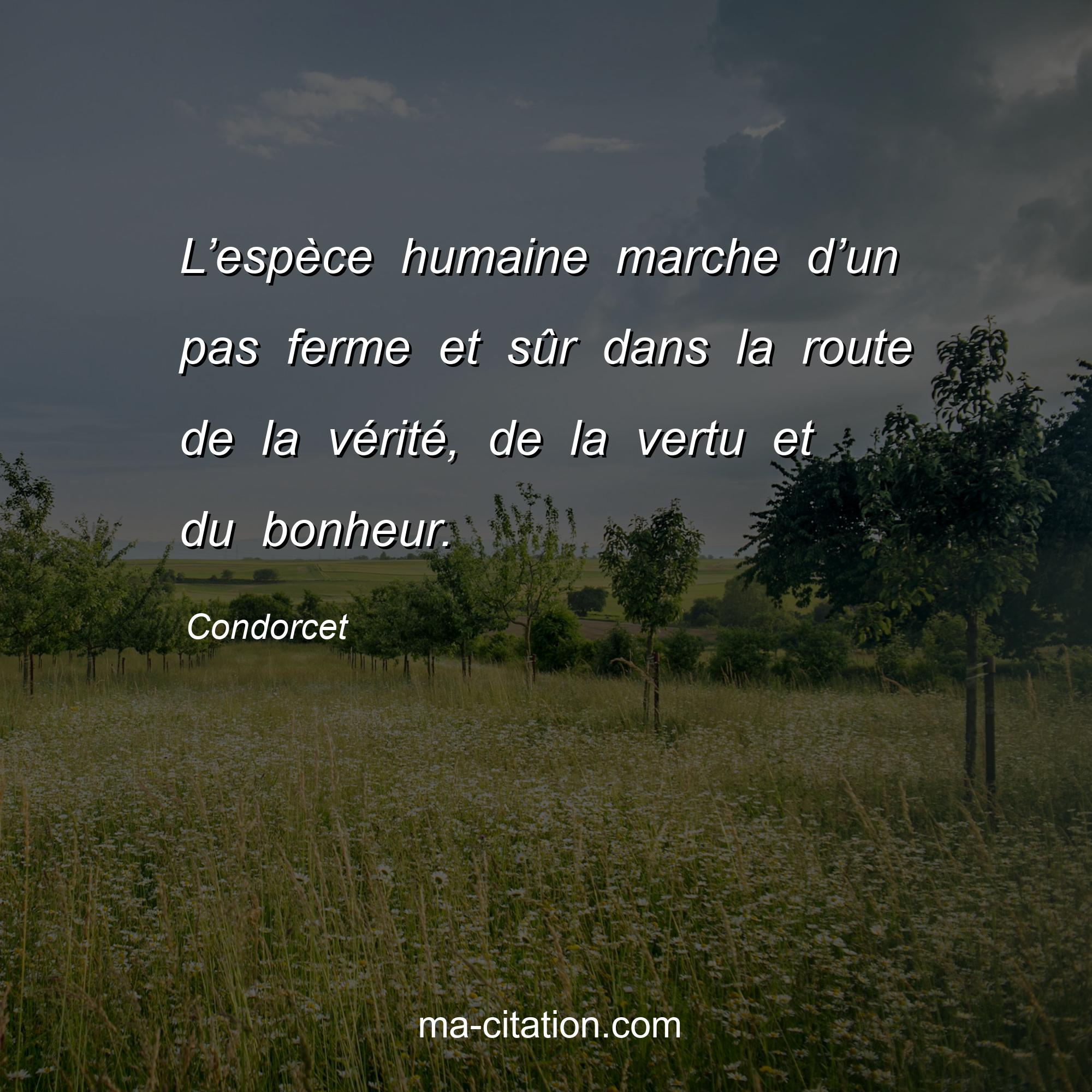 Citation sur la vie de Condorcet :L’espèce humaine marche d’un pas ferme et sûr dans la route de la vérité, de la vertu et du bonheur.