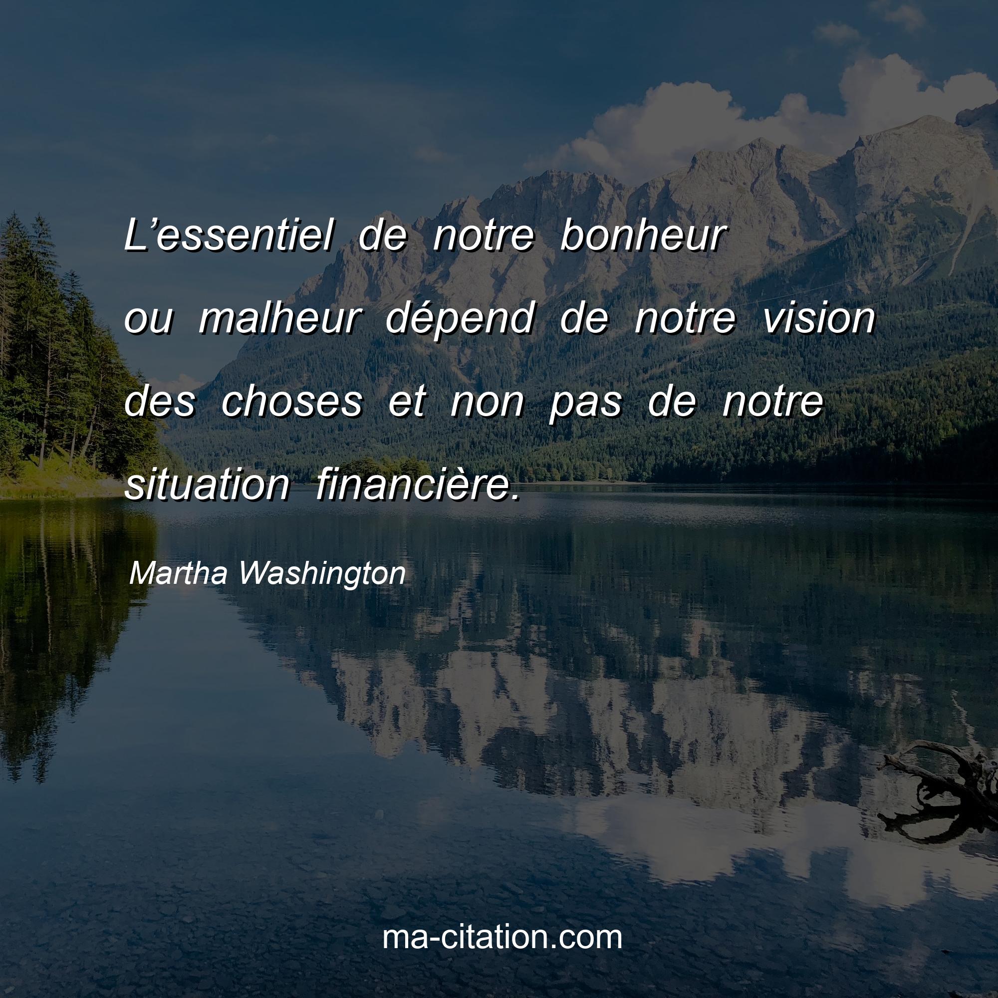 Martha Washington est l'auteur de la citation sur la vie "L’essentiel de notre bonheur ou malheur dépend de notre vision des choses et non pas de notre situation financière.".