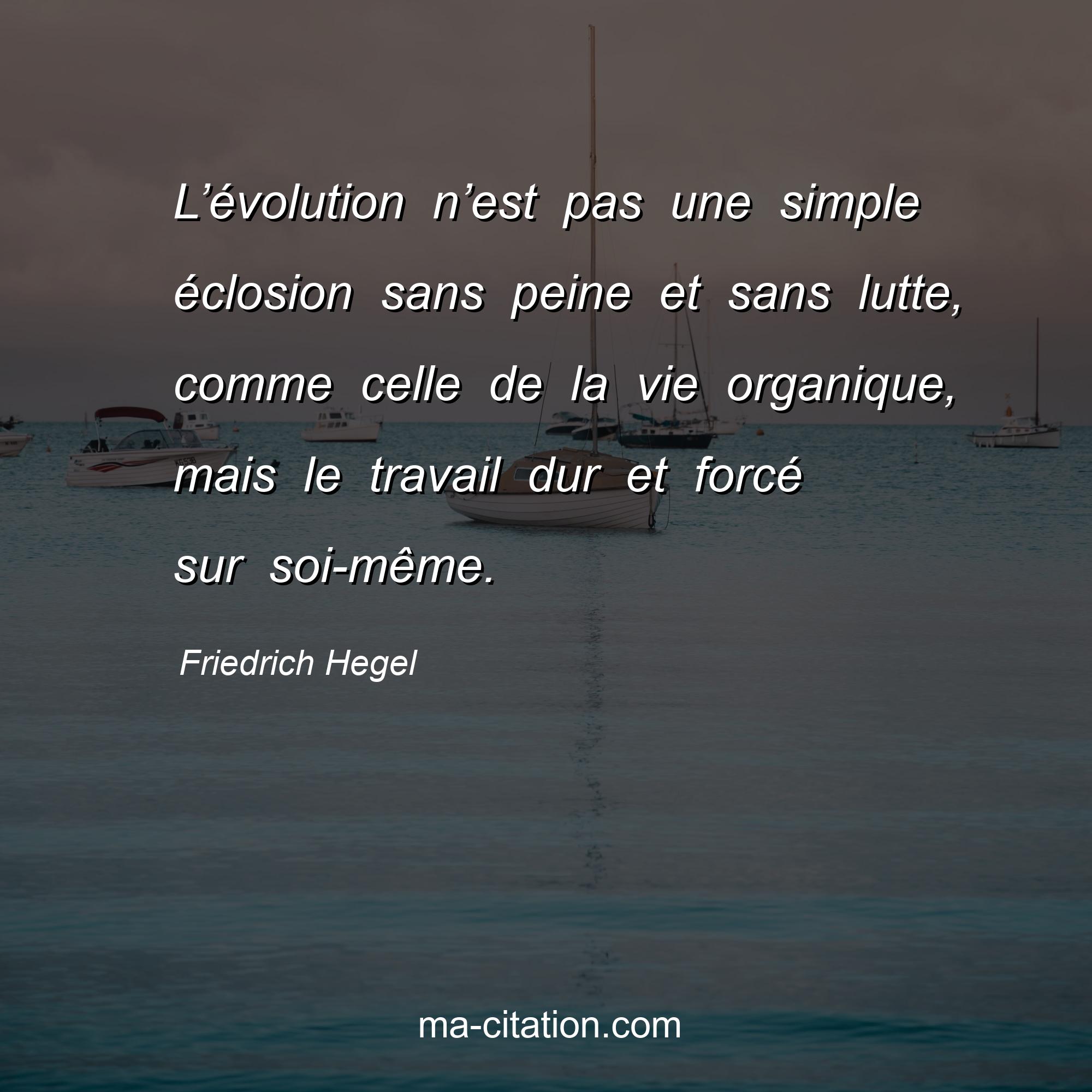 Citation sur la vie de Friedrich Hegel :L’évolution n’est pas une simple éclosion sans peine et sans lutte, comme celle de la vie organique, mais le travail dur et forcé sur soi-même.